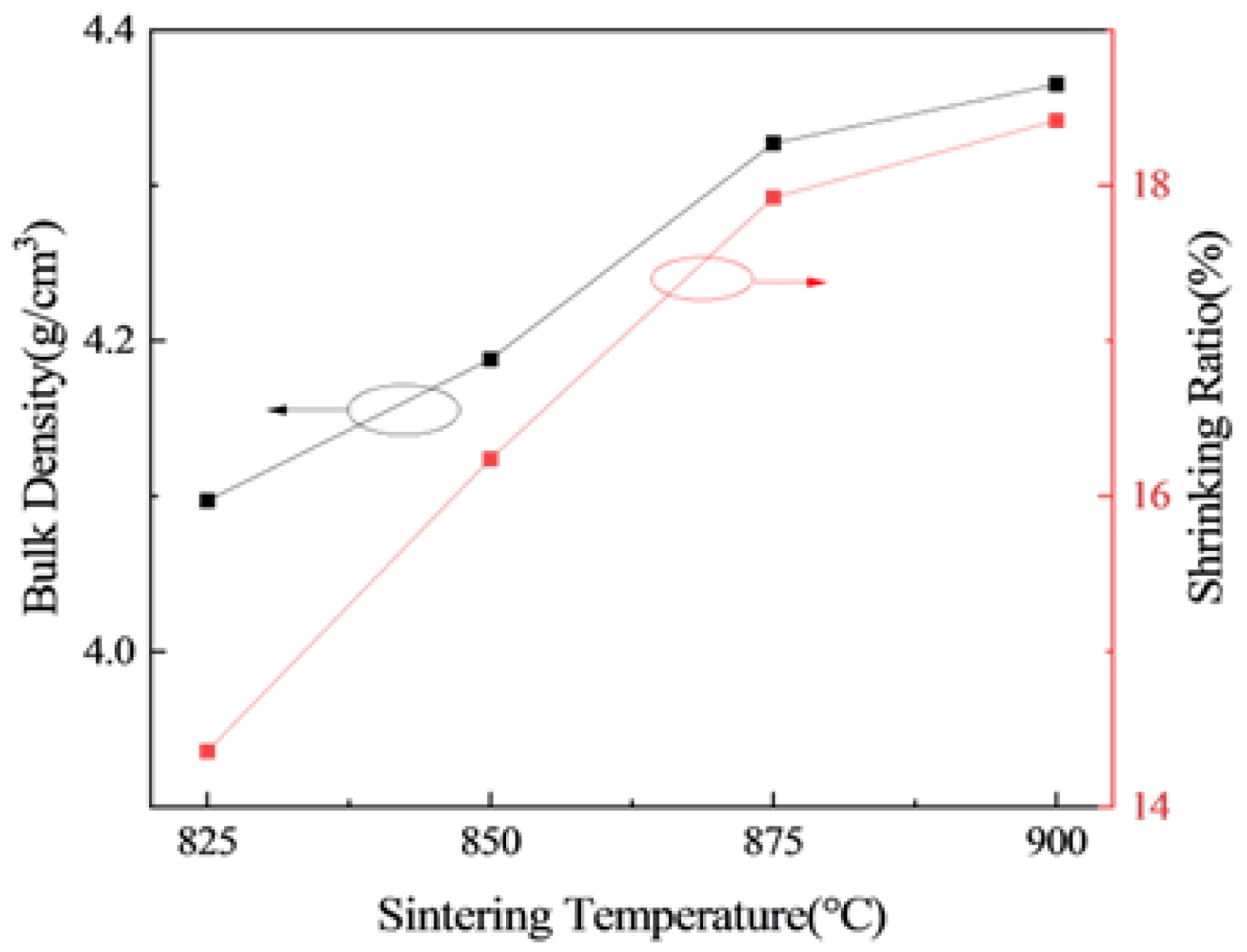 Fig. 2 The density and shrinkage of 0.25LMSOF-0.75LSO under different temperature sintering. |