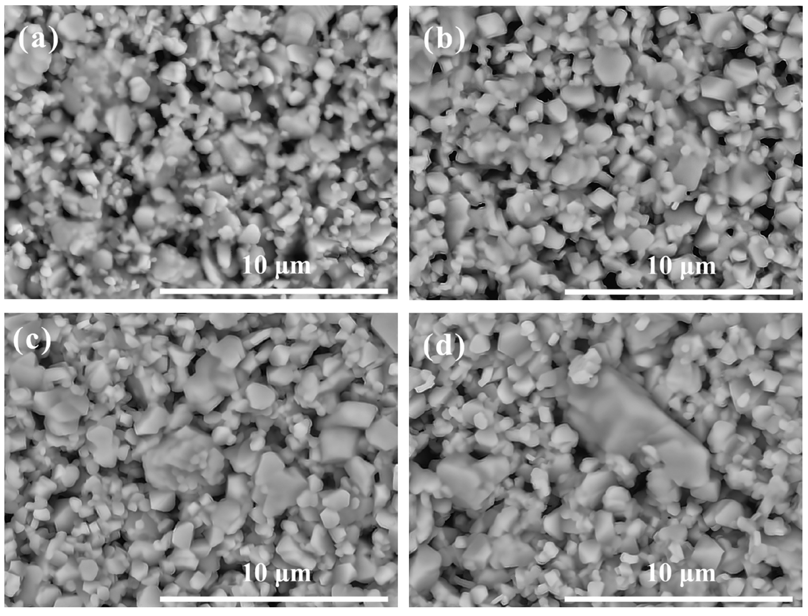Fig. 3 The surface morphology of the 0.25LMSOF-0.75LSO samples under different temperature sintering: (a) 825 oC, (b) 850 oC, (c) 875 oC, (d) 900 oC. |