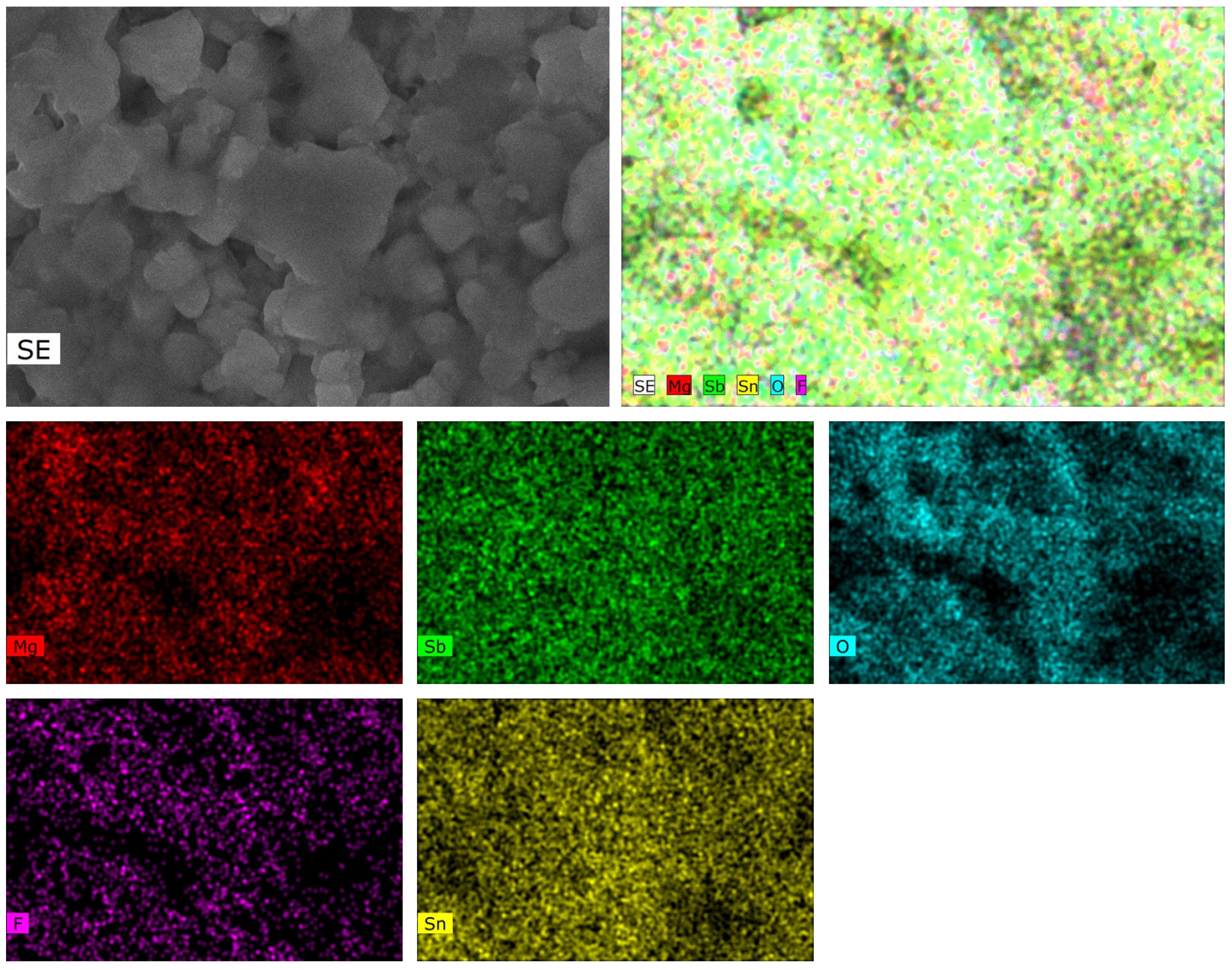 Fig. 3(a)-(e) display the typical SEM graphs of 0.25LMSOF-0.75LSO heated at 825-900 oC. All samples do not look very dense. When the samples were heated at 825 °C, numerous intergranular pores were observed, which tallied well with its poor density, as illustrated in Fig. 2 and Fig. 3(a). As the firing temperature rose, the amount of intergranular pores declined little by little, and a comparatively compact microstructure were gained for 875 oC-heated ceramics. Further increment the heating temperature to 900 oC, an abnormal grain growth emerged, as seen in Fig. 3(d). Moreover, all samples owned two distinct-colored grains (light and black) and similar grain shape, which tallied well with the aforementioned XRD results. To identify the phase composition of distinct-colored grains, the energy dispersive spectrometer was carried out on the 0.25LMSOF-0.75LSO ceramics sintered at 875 oC, as shown in Fig. 4. The elemental mappings results reveal local enrichment of Mg, Sb, and F elements, whereas the Sn element is distributed throughout the entire region, which is slightly different from the XRD results.