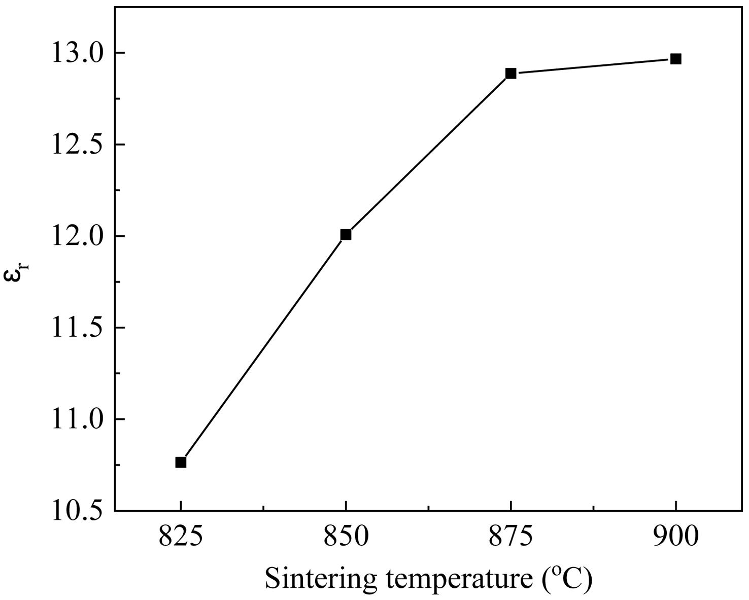 The dependence of εr over sintering temperature of the 0.25LMSOF-0.75LSO samples is exhibits in Fig. 5. The reliance of ɛr upon sintering temperature almost shows a similar inclination to that of densities (Fig. 2), since ɛr in microwave frequency is chiefly influenced by porosity for given composition [21]. The εr of present ceramics increased little by little from 10.7 to 13.0 upon enhancing sintering temperature, which is tightly connected with the reduce in porosity, considering the εr of pores is nearly equal to 1.