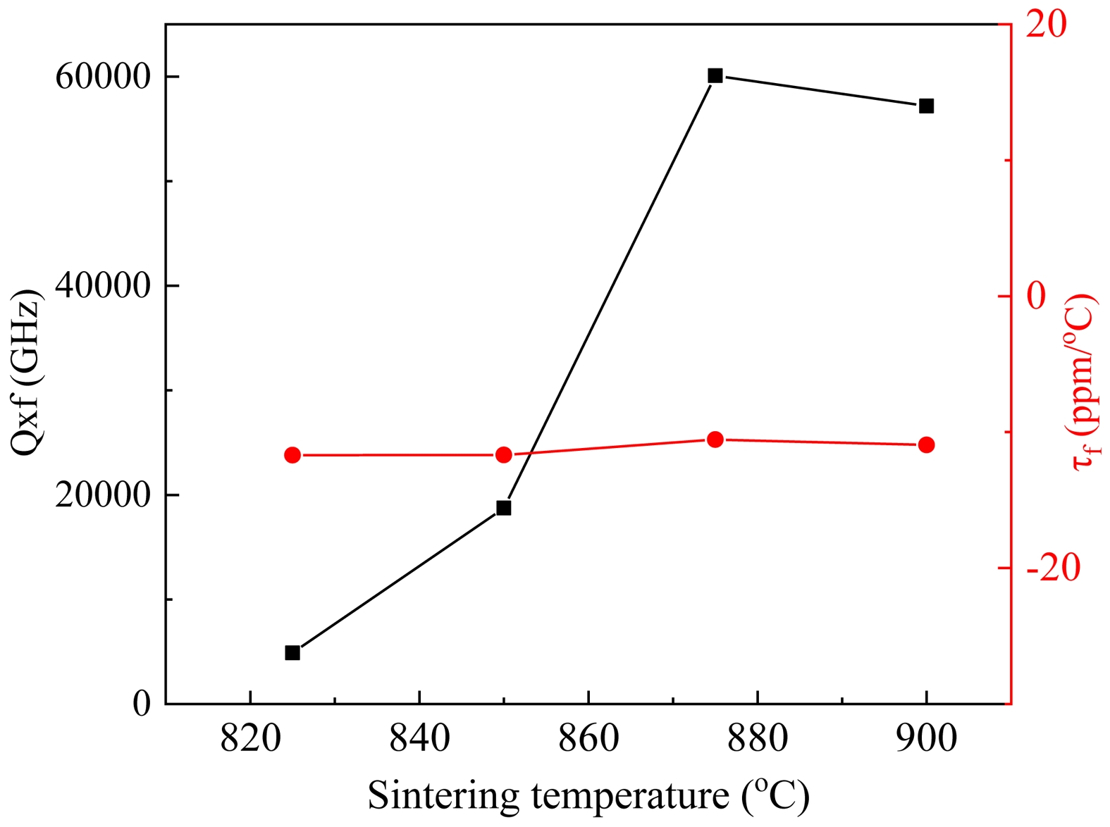 Fig. 6 exhibits the dependence of Q×f and τf of the 0.25LMSOF-0.75LSO samples on firing temperature. The change tendency of Q×f values over sintering temperature is not quite the same as that the variation in either density or ɛr values. It is notice that the change in Q×f value over sintering temperature is far more sophisticated compared to the one in either density or ɛr. The present ceramics displayed a stepwise increment in Q×f values with the wake of firing temperature, achieve a peak value of 60, 100 GHz at 875 °C, and slightly declined in the end with further increasing temperature. The increment in Q×f values is due to the increment in density (Fig. 2), whereas the reduced Q×f values at 900 °C is due to the observed an abnormal grain growth in Fig. 3(d). With regard to τf , as shown in Fig. 6, the τf values is irrelevant to sintering temperature and can remain relatively stable at approximately −10.6 ppm/°C. The τf value is well-known to be influenced by the composition, the additive and the second phase of the materials [22-24]. In current ceramics, the relatively stable τf can attribute to its unchanged phase assemble of Li₄Mg₂SbO₆F and Li₂SnO₃ (seen in Fig. 1), where Li₄Mg₂SbO₆F owns negative τf (-37 ppm/oC) and Li₂SnO₃ owns positive owns negative τf (26.9 ppm/oC) [5, 13].