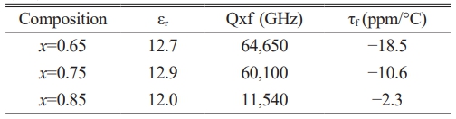 Table 1 summarizes the microwave dielectric properties of 875 °C-sintered LMSOF-LSO ceramics systems. As x rose from 0.65 to 0.85, the εr values first increased and then decreased, while the |τf| and Qxf values gradually decreased. The good comprehensive MDPs could be obtained for the composition of x=0.75. Therefore, the following research was focused on the x=0.75 composition ceramics.