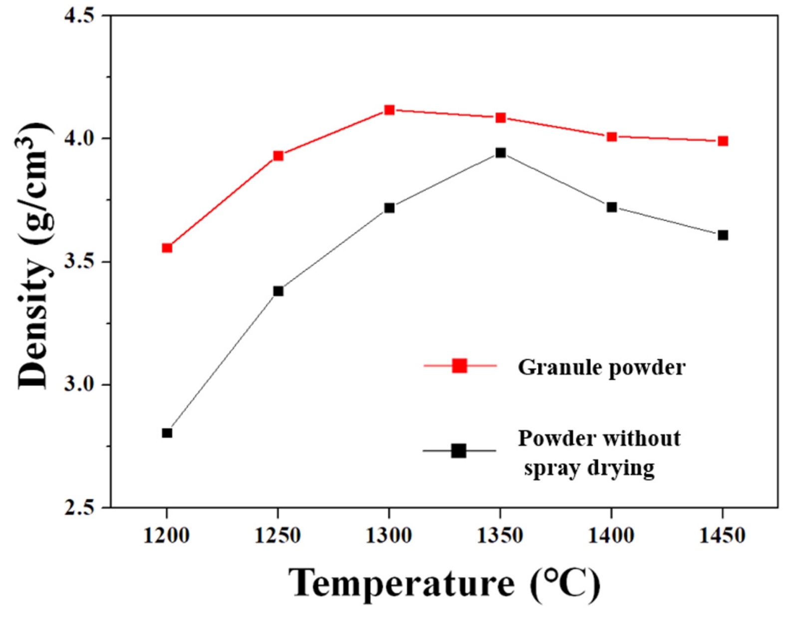 The granules were uniaxially pressed at 1 ton/cm² into disk-shaped compacts (24 mm in diameter). For comparison, compacts were also prepared directly from mixed powders without granulation. The green bodies were sintered in air at 1200-1450 °C for 1 h with a heating rate of 3 °C/min, followed by furnace cooling to obtain black alumina ceramics.