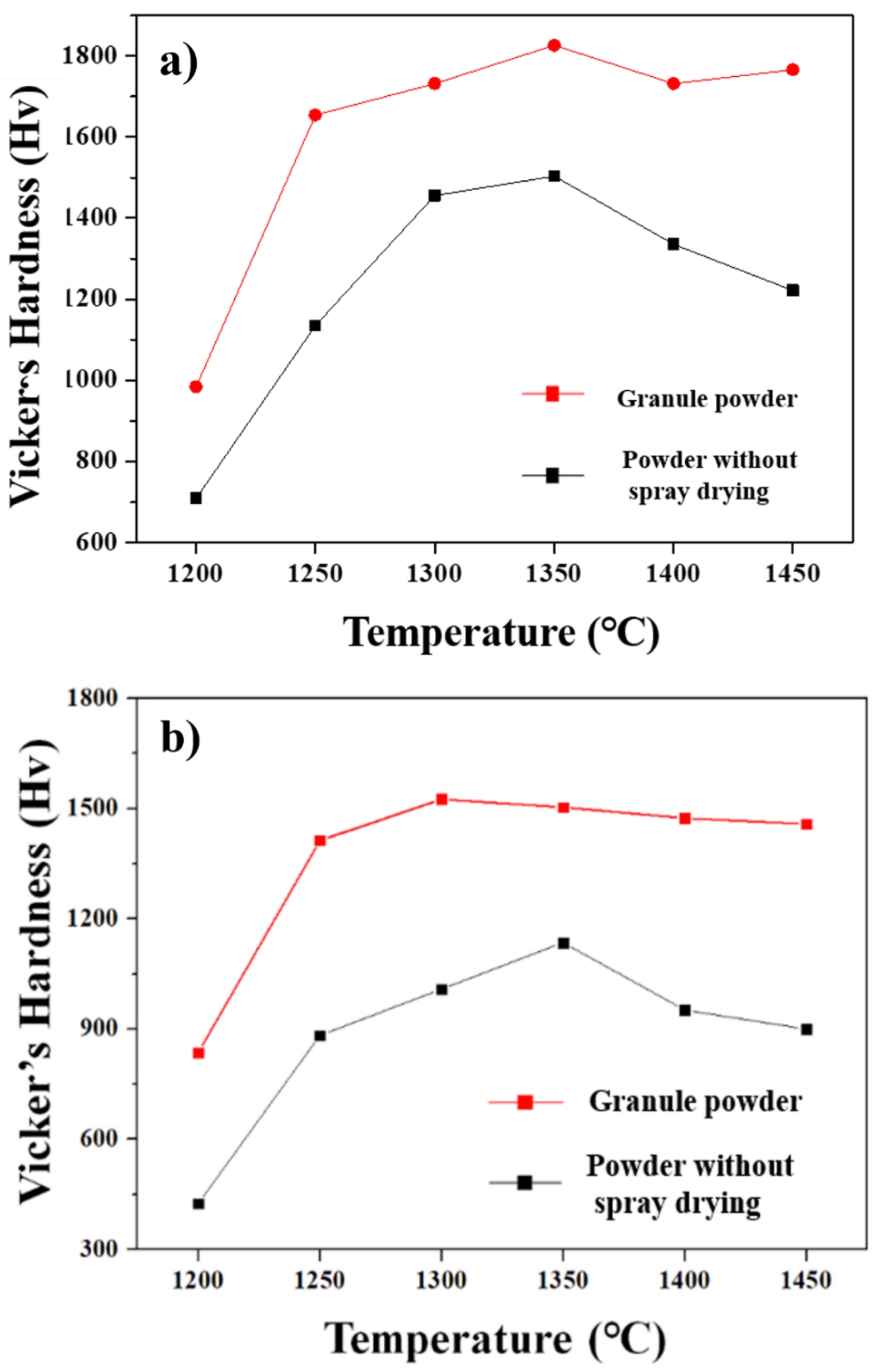 Fig. 6 Measured hardness of black alumina sintered at various temperatures according to different starting powder type of (a) sample 1 (5 wt% additive content) and (b) sample 6 (35 wt% additive content). The black alumina prepared from granules exhibited improved hardness at all sintering temperatures, with a lesser reduction in hardness observed in samples sintered at higher temperatures. |