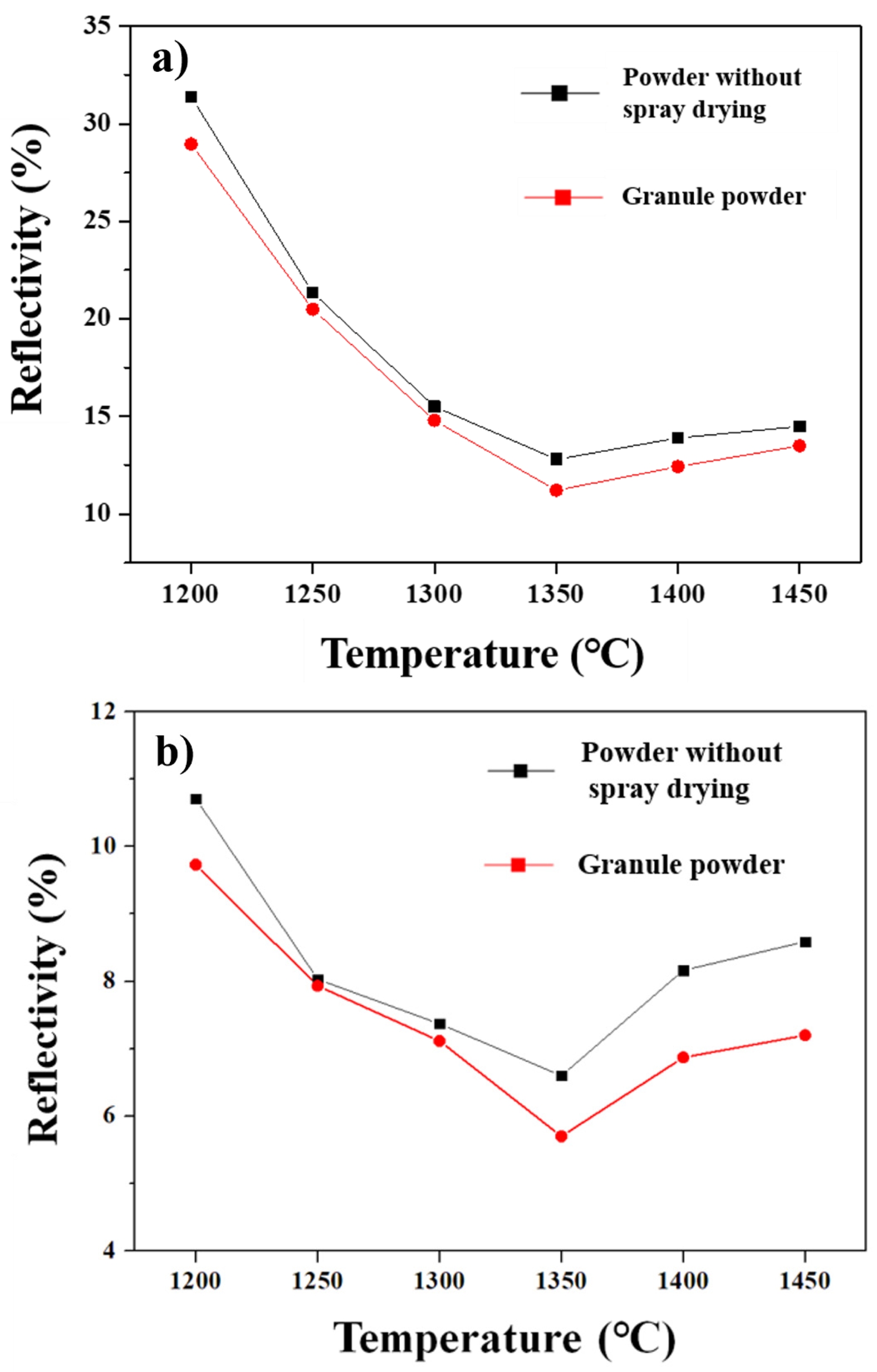 Fig. 7 Measured Reflectivity of black alumina sintered at various temperatures according to different starting powder type of (a) sample 1 (5 wt% additive content) and (b) sample 6 (35 wt% additive content). The black alumina prepared from granules exhibited decreased reflectivity at all sintering temperatures. |