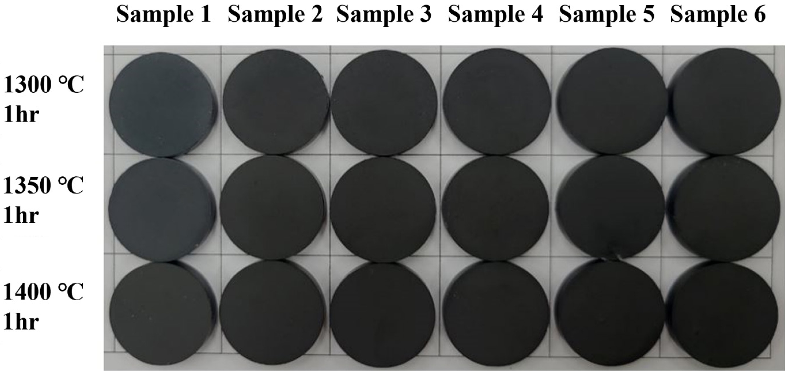 The effect of additive content on color development is shown in Figs. 8 and 9. At 1200 °C (Fig. 8), sample 1 with a low additive content exhibited a greenish tint due to cobalt, whereas sample 6 already showed a black appearance even before achieving full densification. This suggests that black coloration originates from the reactions between the additives and alumina, or from the formation of secondary oxide phases that absorb visible light [6]. At higher temperatures (Fig. 9), all samples exhibited uniform black coloration, and by 1400 °C the black color was clearly visible across all compositions.