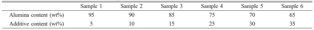 Commercial alumina powder (ALG-ISH, average particle size: 500 nm, purity: 99.8%, Daehan Ceramics, Korea) was used as the starting material. To induce black coloration and promote densification via liquid-phase sintering, various transition-metal oxides were employed as additives: Co₂O₃ (Umicore, 95%), TiO₂ (Samchun, 98.5%), Fe₂O₃ (Duksan, 96%), SiO₂ (Daejung, 99%), MnO (Sigma Aldrich, 99%), ZrO₂ (Daejung, 99%), and ZnO (Daejung, 99%). The mixing ranges are summarized in Table 1, and the compositions of the six experimental samples are listed in Table 2.