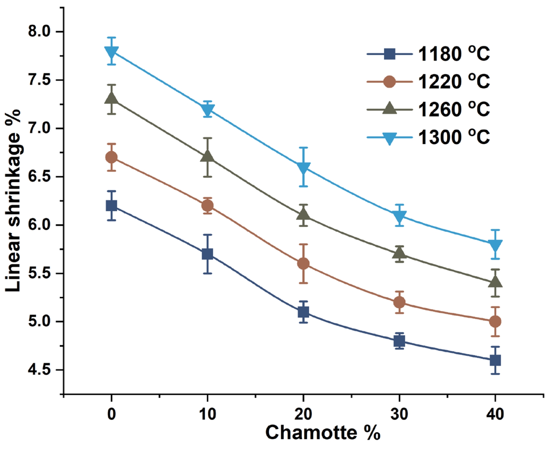The findings show a strong inverse relationship between chamotte content and linear shrinkage at all firing temperatures (1180-1300 °C). In particular, linear shrinkage drops from roughly 6-8% for pure clay (0% chamotte) to 4.5%-5.5% at 40 wt% chamotte (Fig. 1). This decrease suggests that chamotte limits particle rearrangement and densification during sintering, acting as a dimensional stabilizer. Chamotte takes up space in the clay matrix since it is a pre-fired refractory material that is chemically inert and does not significantly shrink [14]. As a result, it mitigates overall dimensional changes by lowering the effective clay proportion that causes shrinkage. The relative decrease in shrinkage with increasing chamotte is continuous, but somewhat higher shrinkage values at higher temperatures can be explained by improved sintering kinetics, which encourage particle bonding and densification. For thick-walled ceramics, tiles, or sculptural elements where drying or firing-induced cracking is an issue, the data indicate that even modest chamotte additions (10-20 wt%) are adequate to control linear shrinkage.
