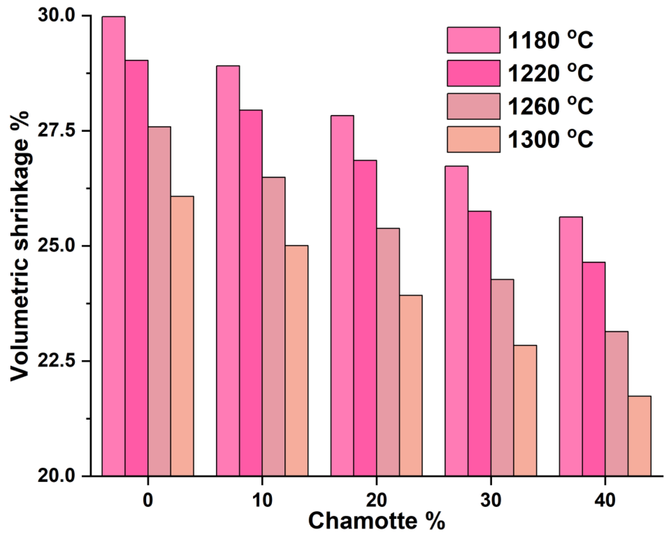 Similar to linear shrinkage, volumetric shrinkage gradually decreases from ~27-29% in unaltered clay to ~22-25% at 40 wt% chamotte (Fig. 2). Due to the combined effects of matrix densification and the limited mobility of clay particles imposed by chamotte, the decrease is somewhat increased at higher firing temperatures. The shrinkable volume is reduced by replacing a portion of the shrinkable clay with non-shrinking chamotte, which lessens internal tension buildup during drying and firing. Differential shrinkage can cause warping or microcracking in components with complicated geometries, making this effect especially pertinent. As a result, chamotte addition reduces volumetric stresses in the clay body while simultaneously stabilizing dimensions and serving as a microstructural buffer.