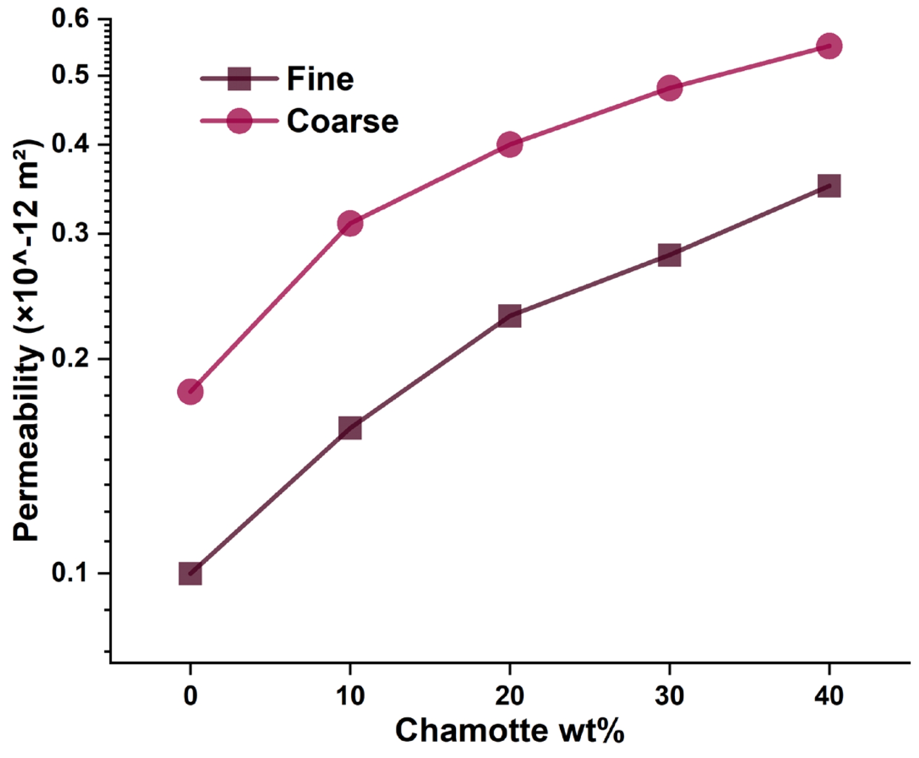 Fig. 4 Permeability vs. chamotte content. Permeability rises with higher chamotte content, with coarse chamotte showing consistently higher values than fine chamotte. |