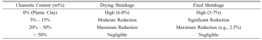 Chamotte-tempered clay bodies because of their improved dimensional stability and regulated drying and firing behavior, have become the material of choice for large-scale and structurally challenging clay sculpture. This study assesses the effects of chamotte particle size, content, and physical properties on mechanical performance, shrinkage, and workability in sculptural clay compositions. The use of chamotte, an inert, pre-fired grog, minimizes warpage and cracking in large or intricate sculptural shapes by drastically reducing drying and firing shrinkage. For outdoor installations and high-temperature artistic procedures, refractory inclusions also improve handling stability, load-bearing capability after firing, and tolerance to abrupt temperature changes. Coarse chamotte was shown to improve stiffness and sustain massive shapes, while finer chamotte boosted strength and enabled accurate detailing, according to experimentally obtained performance data and findings published in the ceramic literature. The findings highlight how crucial it is to choose the right chamotte grading and content in order to attain a harmonious blend of workability, structural dependability, and long-term durability. In order to assist artists, designers, and conservators in creating optimal clay bodies for sophisticated sculptural applications, this study offers a useful framework based on materials science.