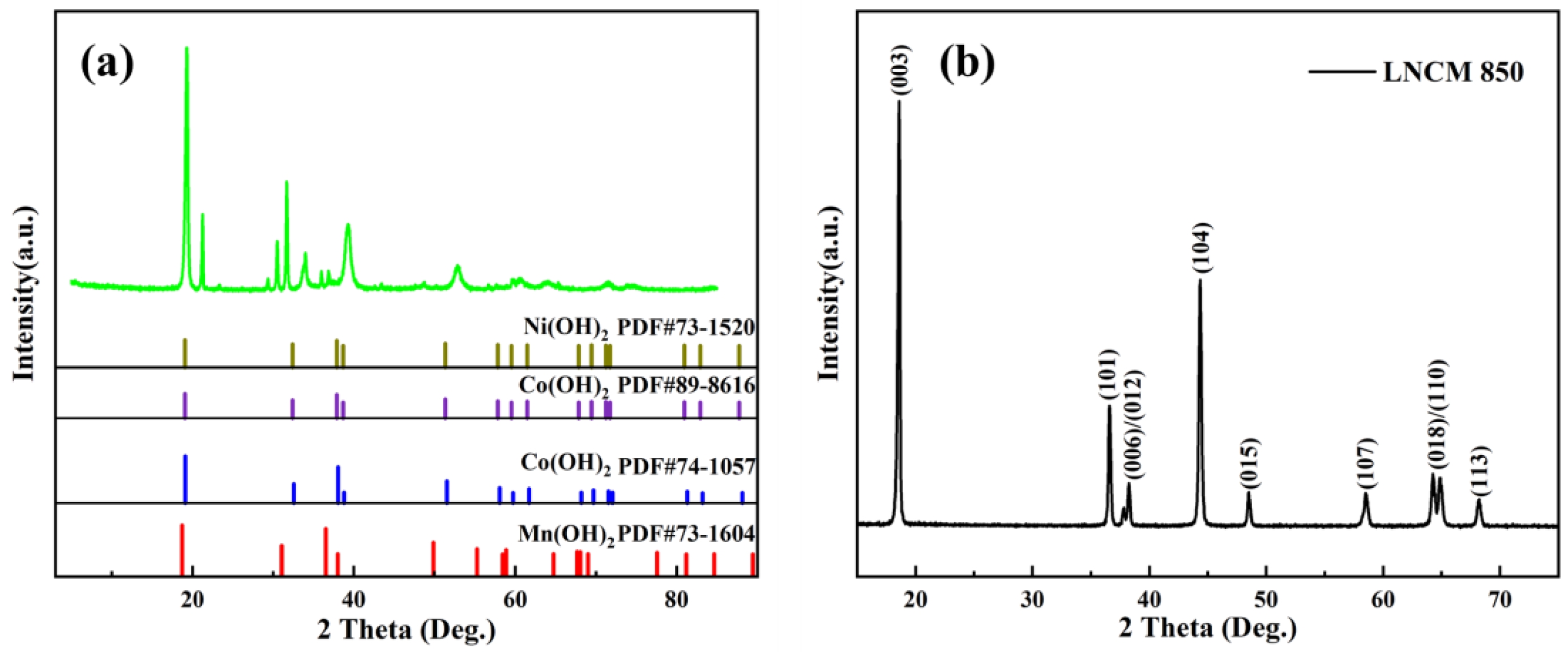 Fig. 2 shows the XRD patterns of LNCM precursors before (a) and after (b) heating. The diffraction analysis confirms the successful synthesis of LNCM lithium-ion cathode material via solid-state reaction at 850 °C for 10 hours, as evidenced by the complete transformation of precursor phases into the characteristic LNCM crystal structure [26, 27].