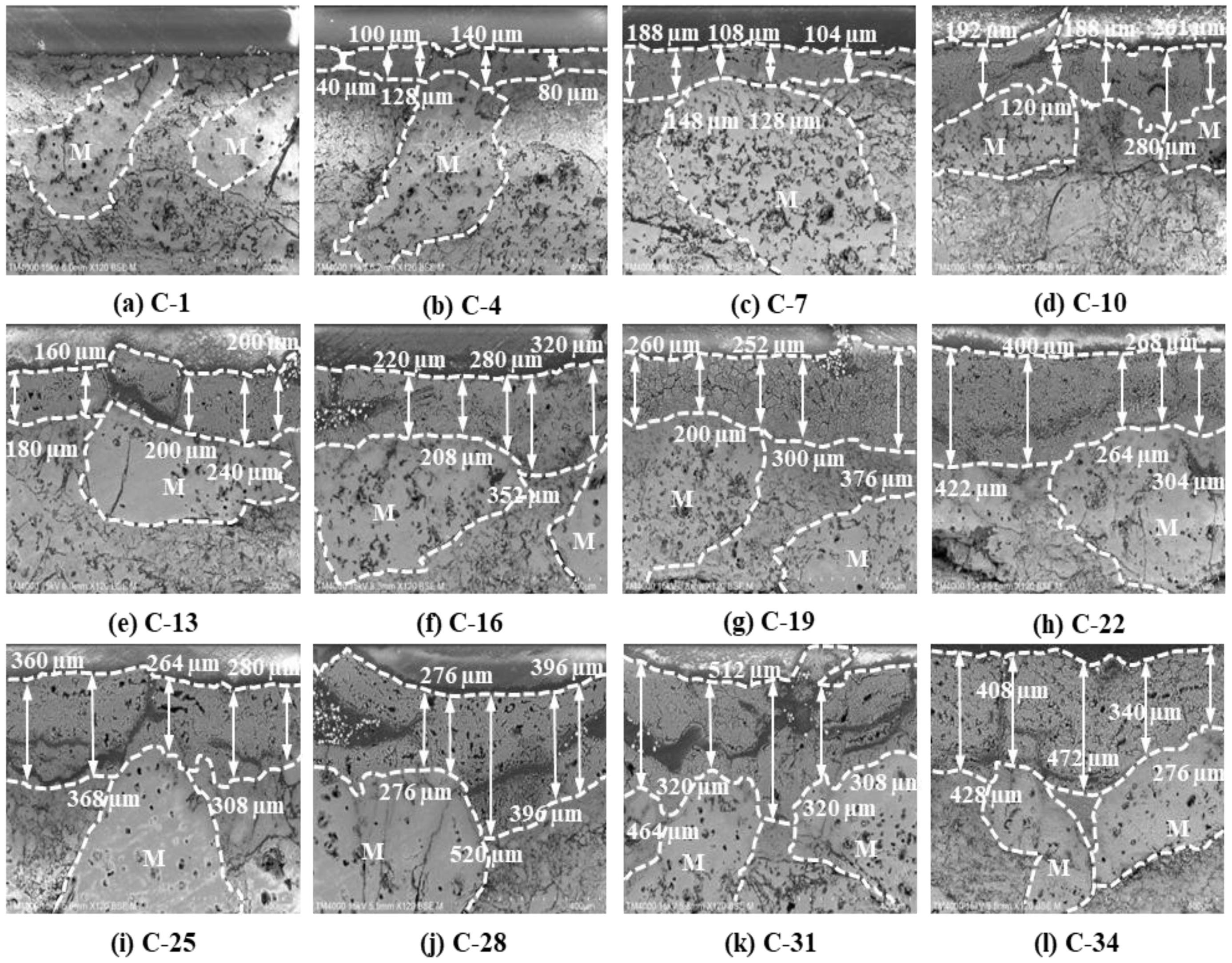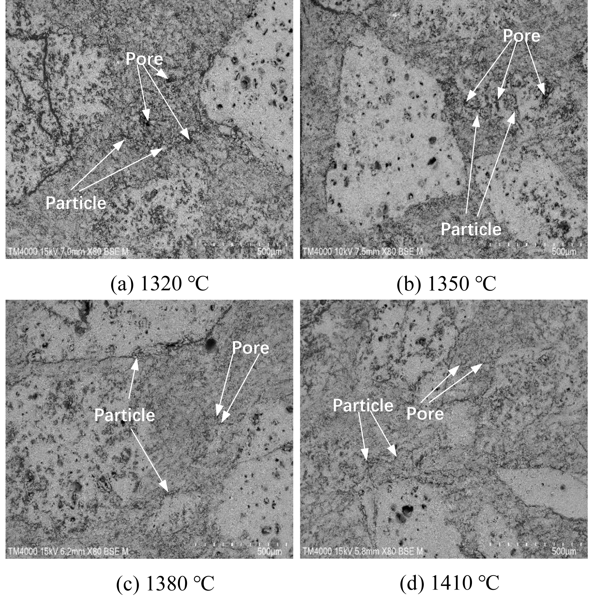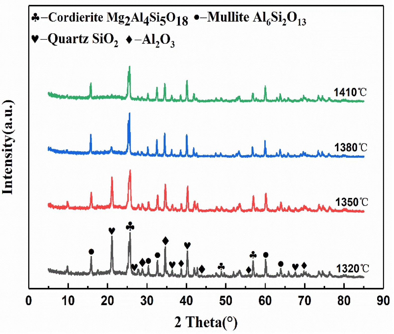 Fig. 3 presents the XRD patterns of the saggar blocks sintered at various temperatures. In the temperature range of 1320 to 1380 °C, the primary crystalline phases consist of cordierite (Mg2Al4Si5O18), mullite (Al6Si2O13), corundum (Al2O3), and silica (SiO2). The absence of diffraction peaks corresponding to Foshan yellow clay and coal gangue confirms the complete decomposition of the kaolinite in the clay [28]. The diffraction patterns reveal systematic phase transformations with increasing temperature: the peak intensities of SiO2 and Al2O3 gradually decrease while those of cordierite and mullite increase. This is attributed to the liquid-phase reaction of SiO2 and Al2O3, forming mullite and cordierite (Equations 1 and 2) [28]. At 1410 °C, the diffraction peaks of SiO2 disappear completely, accompanied by reduced intensity in the diffraction peaks for mullite, cordierite, and corundum. This phenomenon occurs because trace oxides (CaO, Fe₂O₃, TiO₂) lower the system’s eutectic point, promoting liquid phase formation that diminishes the crystallinity of the primary phases [29].