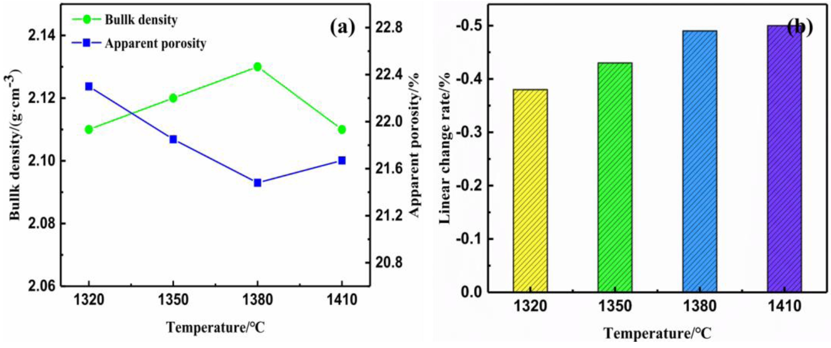 Fig. 4 Bulk density and apparent porosity (a) and linear change rate (b) of saggar blocks sintered at different temperatures for 3 hours. |