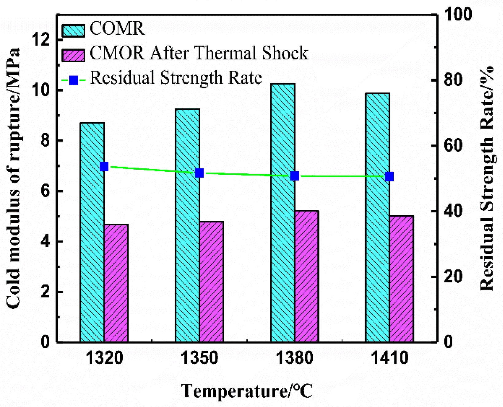 Fig. 6 Room-temperature flexural strength, residual strength, and residual strength retention of saggar blocks sintered at different temperatures. |