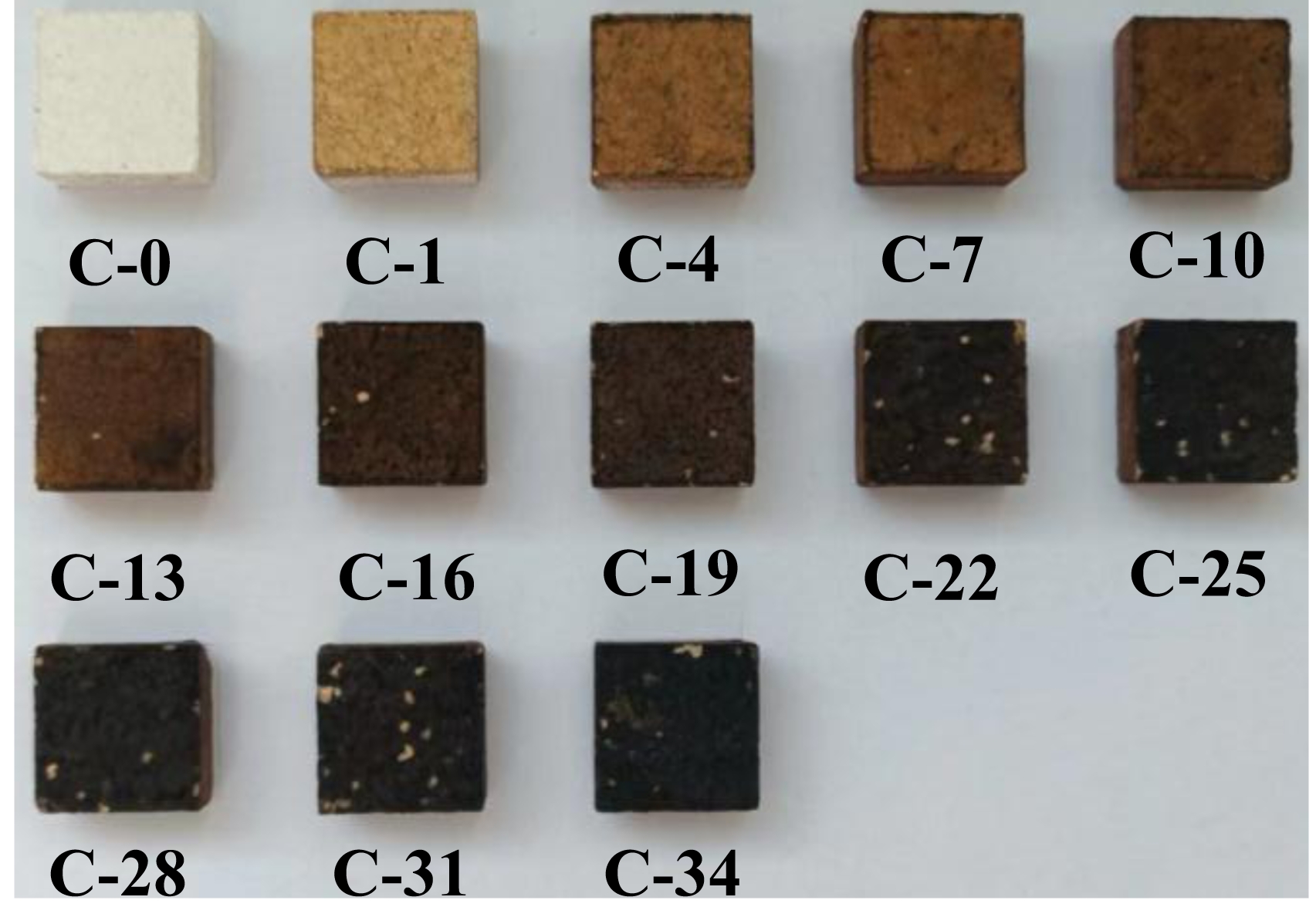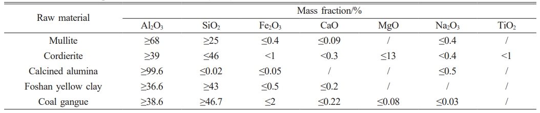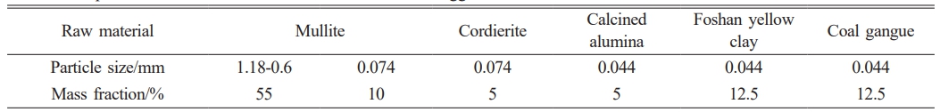 The raw materials used in this study consisted of: mullite particles in two size fractions (coarse: 1.18-0.6 mm; fine: ~0.074 mm), cordierite (~0.074 mm), calcined alumina (~0.044 mm), Foshan yellow clay (~0.044 mm) and coal gangue (~0.044 mm). All ceramic raw materials were sourced from Ningxia Jingyuanda New Material Technology Co., Ltd. (China). Industrial dextrin and deionized water were employed as processing aids. The chemical composition of the raw materials and the detailed experimental formulation of the mullite-cordierite composite are presented in Tables 1 and 2, respectively.