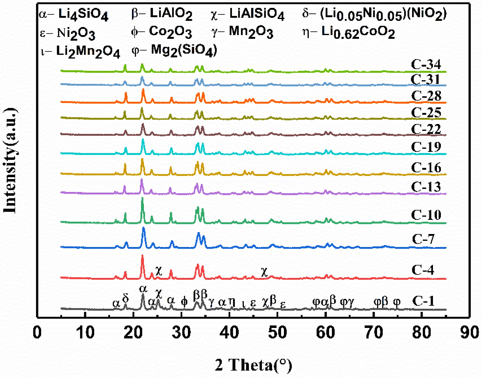 The phase composition of the saggar samples was examined utilizing an XRD-6000 X-ray diffractometer (Shimadzu Co., Japan) with Cu Kα radiation (λ = 1.5406 Å). Scans were performed from 5° to 85° at a rate of 2°·min⁻¹. The subsequent XRD analysis was conducted using MDI Jade 6. Microstructural characterization of the saggar samples was performed using a TM4000Plusll scanning electron microscope (Hitachi Co., Japan) for morphological analysis, and an energy-dispersive X-ray spectrometer (SIGMA 500, Zeiss Co., Germany) for elemental microanalysis.