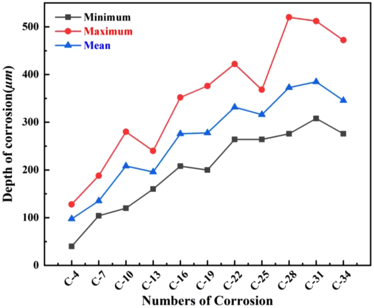 Fig. 12 Surface corrosion depth development with increasing corrosion cycles. |