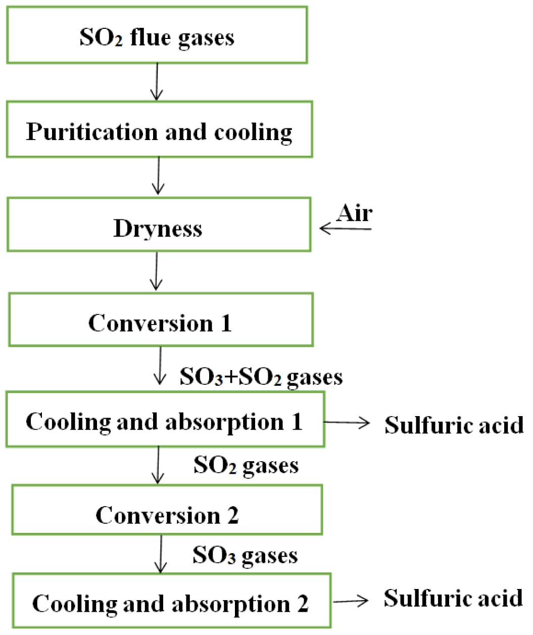 The sulphuric acid is produced from SO2 flue gases by purification, dry and conversion unit in acid manufacturing systems. The typical manufacturing process of sulphuric acid is shown in Fig. 2. On the other hand, wet gas sulfuric acid process is very well suited for industrial gases due to its ability to treat wet gases without additional drying steps [46].