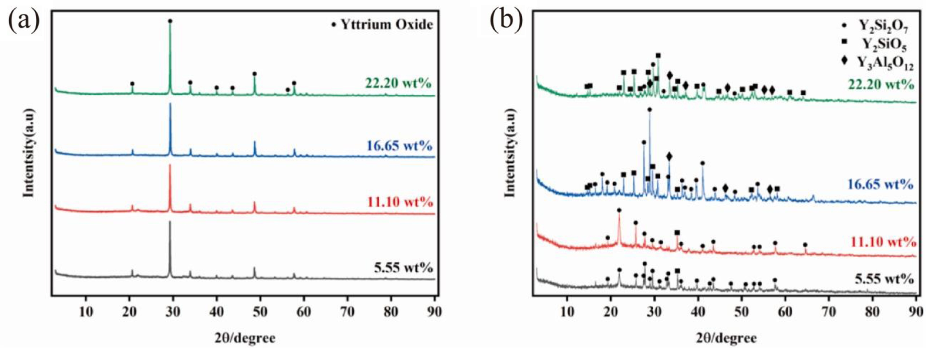 In Fig. 3(a), the phase composition of yttrium-silica coatings with different silica sol contents after sintering is characterized. The XRD spectrum shows the diffraction peak corresponding to yttrium, and there are no other crystal phases. Fig. 3(b) shows the XRD spectra of the coating after heat treatment at high temperature. By comparing the two figures, it can be observed that the yttrium diffraction peak disappears after the simulation casting treatment. This is because yttrium and silica undergo a chemical reaction at temperatures ranging from 1000 °C to 1600 °C to form yttrium silicate [35]. As the content of silica sol increases, the yttrium silicate diffraction peak becomes stronger, indicating that a greater amount of yttrium silicate has been formed [36].
