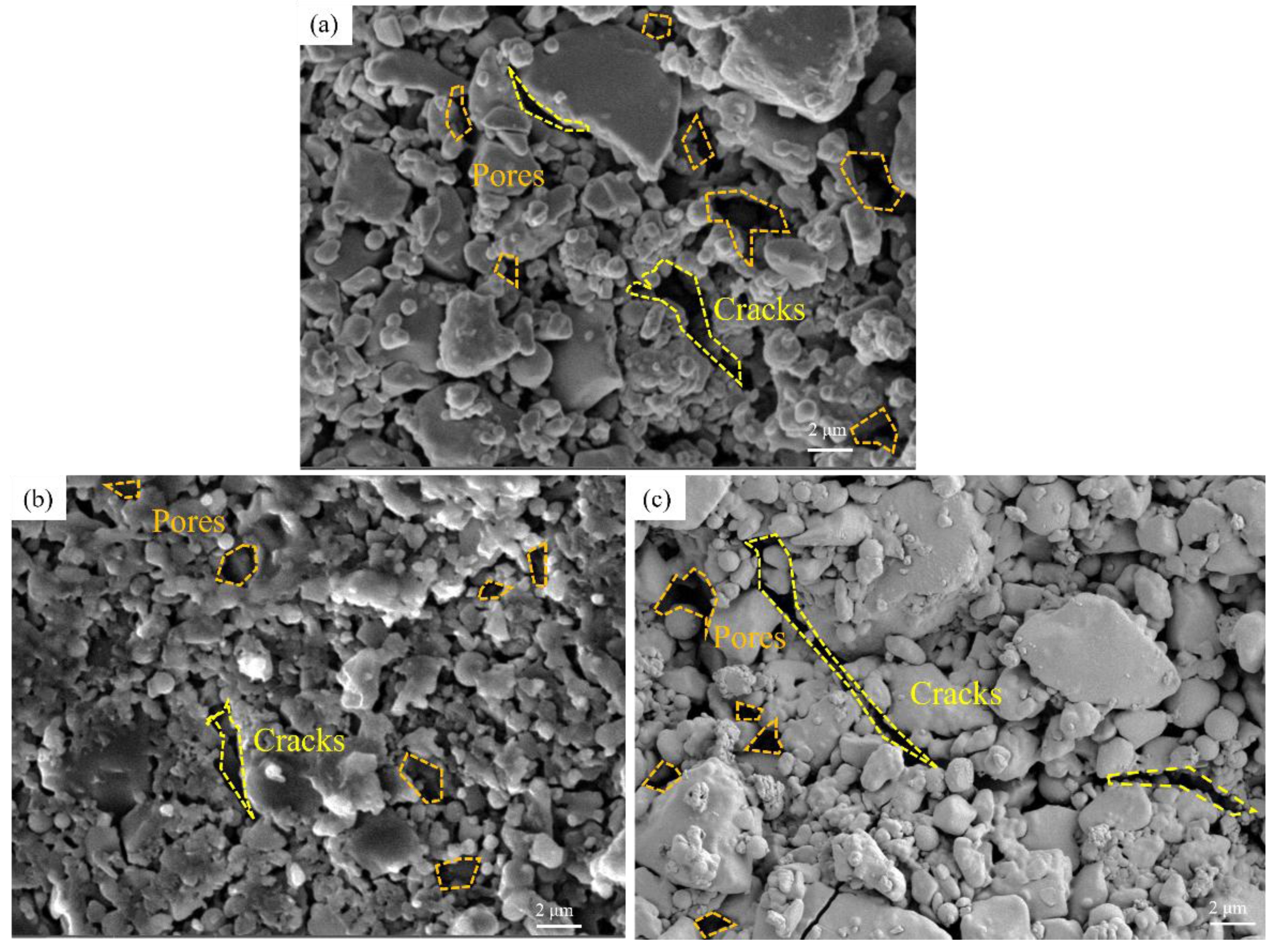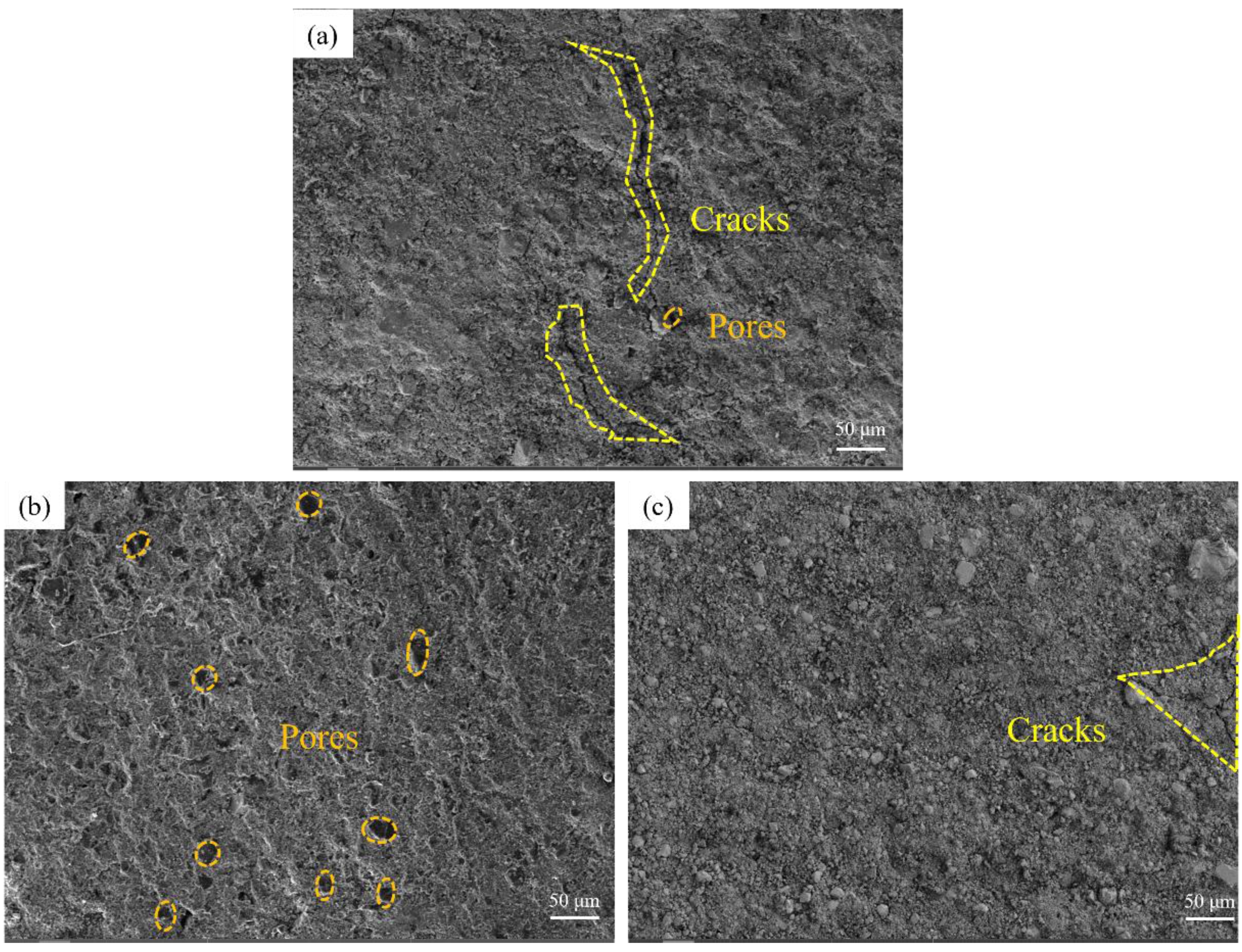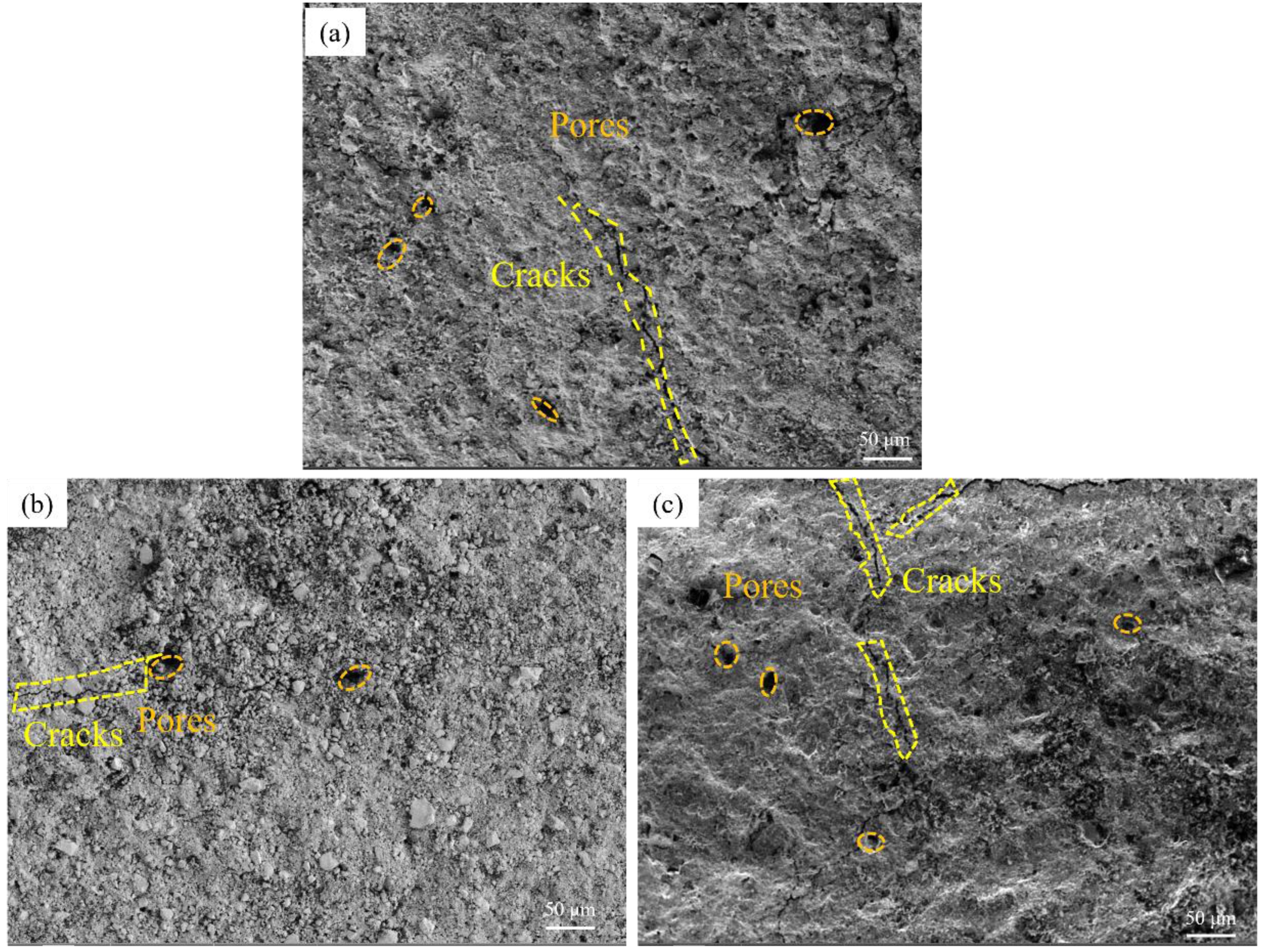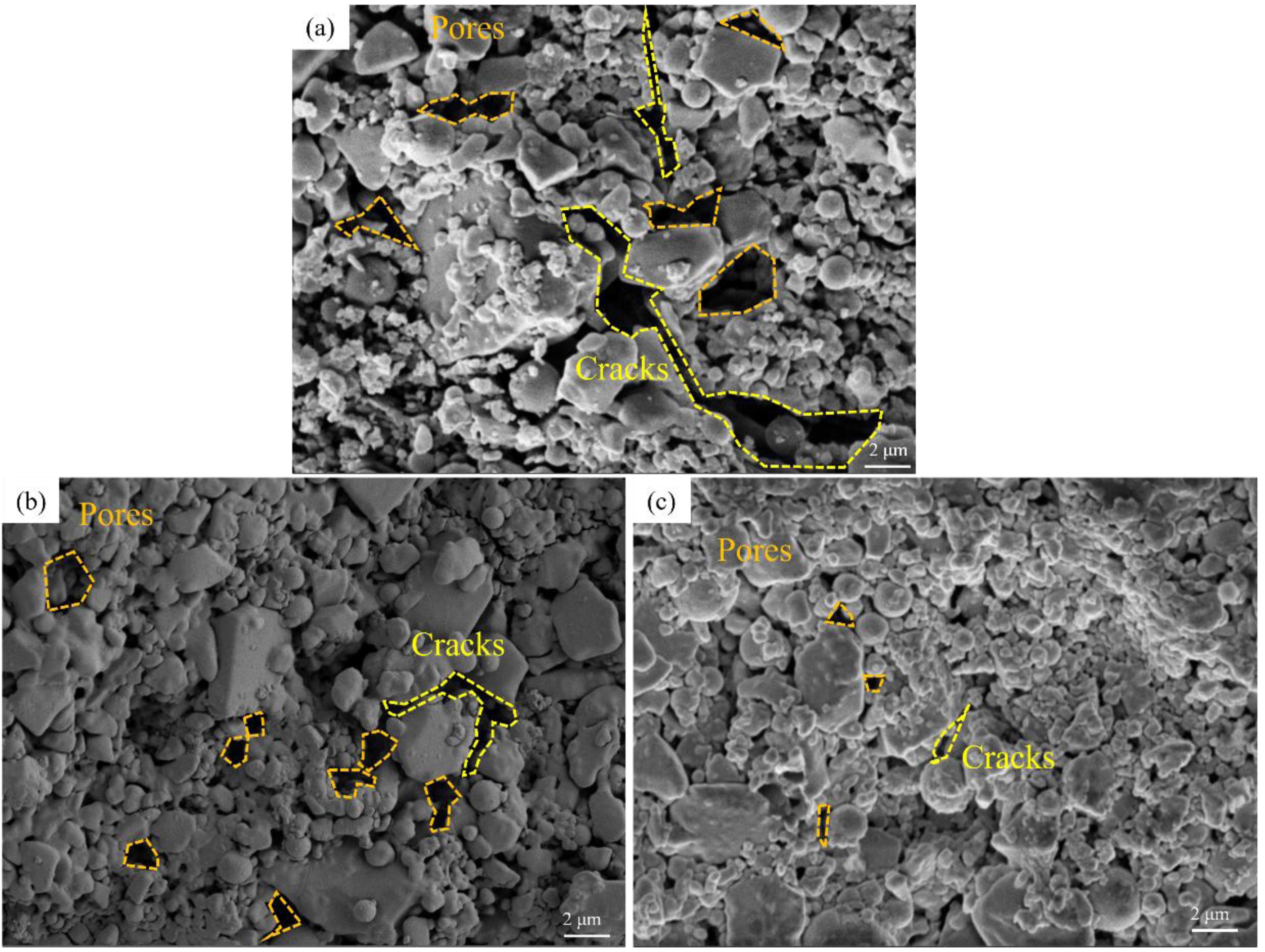 Unlike Cl-, Y(NO3)3 has been proved to be a suitable sintering agent capable of improving the sintering of ceramics, but unlike this study, previous studies usually investigated its use with ceramic powders [42-44]. Fig. 5 shows the microstructure of ceramic samples impregnated with different concentrations (0.010, 0.020, 0.030 mol/L) of Y(NO3)3 solution after sintering. Fig. 5(a) shows the sintered microstructure of an impregnated sample with a Y(NO3)3 concentration of 0.010 mol/L. A long crack can be observed in the image. The strength of the sample is low, and it is easy to crack in advance. When the concentration is increased to 0.020 mol/L(Fig. 5(b)), no cracks can be observed in the figure, only many small pores. When the concentration continues to increase to 0.030 mol/L (Fig. 5(c)), only a tiny crack can be observed in the sample. The results indicated that, with the increase of Y(NO3)3 concentration in the solution, the densification of ceramics was improved and the macroscopic defects disappeared.