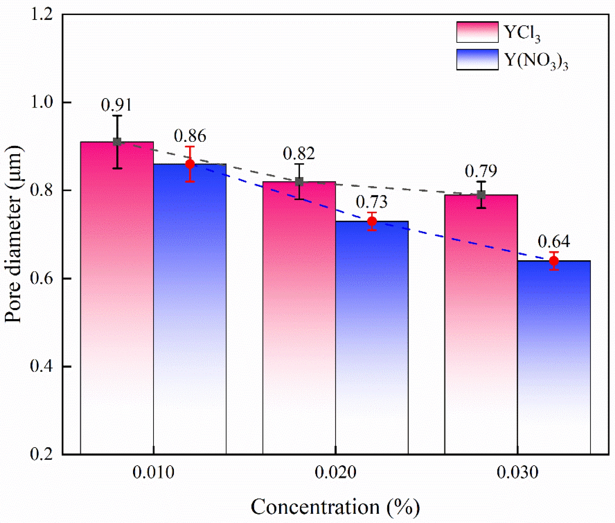 In order to compare the degree of improvement in sintering of the two impregnating solutions, the pore size was digitally measured in the high-resolution SEM images, and the results are shown in Fig. 7. It can be observed that the pore diameter decreases with the increase of solution concentration, and the pore diameter of the sample impregnated by a Y(NO3)3 solution was smaller than that of the sample impregnated by a YCl3 solution at the same concentration. With the increase of concentration, the pore diameter of the sample impregnated with the Y(NO3)3 solution decreased significantly. When the concentration increased from 0.010 mol/L to 0.030 mol/L, the pore diameter decreased by 25.58% (from 0.86 ± 0.04 μm to 0.64 ± 0.02 μm). When the concentration of YCl3 solution increased from 0.010 mol/L to 0.030 mol/L, the diameter of the pores in the impregnated sample changed by only 12.37% (from 0.91 ± 0.06 μm to 0.79 ± 0.03 μm). Moreover, the pore diameter of samples infiltrated with YCl3 solutions with a concentration of 0.020 mol/L was 0.82 ± 0.04 μm, showing little change compared with that of a YCl3 solution with a concentration of 0.030 mol/L (0.79 ± 0.03 μm).