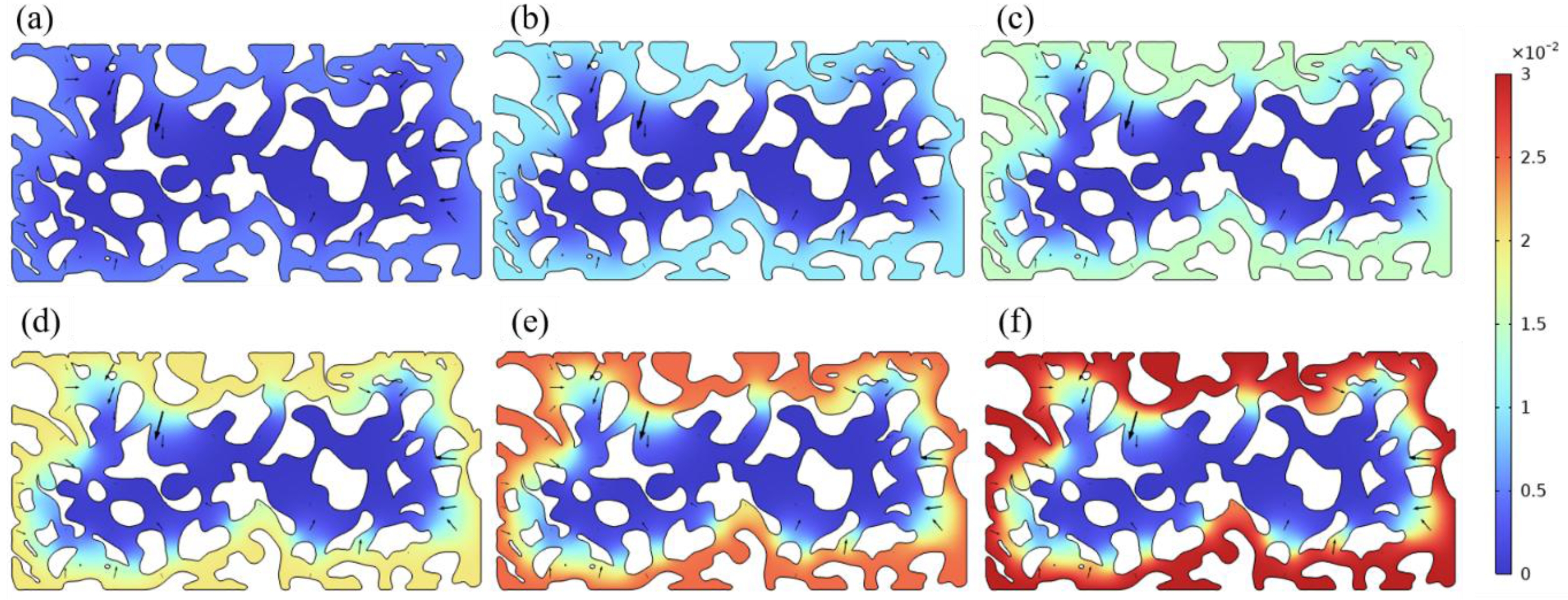 The diffusion of yttrium in silicon samples during the sintering process of impregnated silicon samples was simulated by using COMSOL software. A porous medium model was established in the COMSOL software to simulate the diffusion of yttrium at different concentrations. To more clearly explore the influence of different concentrations of impregnating solutions on the impregnation process, the only variable for simulation was the different concentrations of the impregnating solutions. Studies have shown that in the low concentration range (<0.1 mol/L), the diffusion coefficient changes less with the increase of concentration [45]. Therefore, the diffusion coefficients of this simulation are all consistent, ignoring the slight differences caused by different concentrations. The remaining parameters are all from the material library that comes with the COMSOL software.Based on the study of Nazyrov et al. [44]., D=2.0310-12 was selected as the diffusion coefficient. For other material parameters, the software built-in database was used. Fig. 8 is a simulation diagram of yttrium diffusion after sintering of samples impregnated with yttrium solution of different concentrations (concentration=0.005, 0.010, 0.015, 0.020, 0.025, 0.030%). The viewing angle is the viewing angle of the upward view, that is, the viewing surface is the contact surface with the build platform. The color in the figure represents the concentration of yttrium, the closer the color is to red, the higher the concentration, and the closer the color is to blue, the lower the concentration. It can be observed that the yttrium element has a limited diffusion depth inside the silica sintered sample, and the closer to the core, the less yttrium element content. As expected, the higher the concentration of yttrium solution, the higher the concentration of yttrium element impregnating the sample, and the deeper the diffusion.
