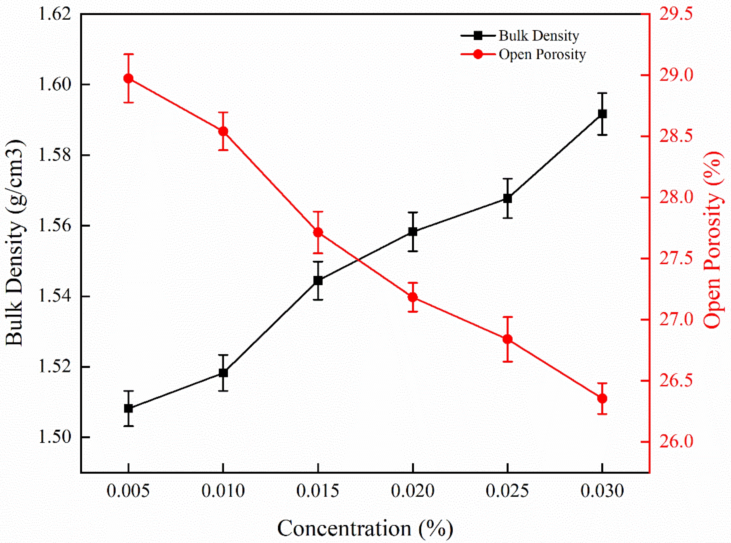 The bulk density and porosity of the sample were measured by the Archimedes’ method. The results for the samples impregnated with Y(NO3)3 solutions of different concentration are shown in Fig. 9. We can observe that, with the increase of the concentration of Y(NO3)3, the density presents a linearly increasing trend, while the porosity shows a decreasing trend with increasing Y(NO3)3 concentration. When the concentration of Y(NO3)3 increased from 0.005 mol/L to 0.030 mol/L, the bulk density increased 4.87% by 0.074 g/cm3 (from 1.518 ± 0.005 g/cm3 to 1.592 ± 0.006 g/cm3), while the open porosity decreased by only 2.19% (from 28.54 ± 0.16 vol% to 26.35 ± 0.13 vol%). The density of the samples was successfully increased with limited reduction in porosity. Consistent with the conclusions in Fig. 5, Fig. 6 and Fig. 7, the densification of ceramics was improved with the increase of Y(NO3)3 concentration, with yttrium promoting the growth of crystals and reducing the defects in the microstructure. However, since the yttrium was added by dipping in this study, and the solution concentration was low, the observed effects concerning the sample density are not very strong. Beniaiche et al. [38]. discovered through XRD experiments and FTIR spectra experiments in multi-component silicate glass, they found that the higher the concentration of Y2O3 leading to the higher the degree of crystallization. They attributed this to that the Y2O3 acting as a network modifier, effectively increasing the frequency of Si-O-X bonds and enhancing the bonding strength of atoms in the crystalline phase of the material.