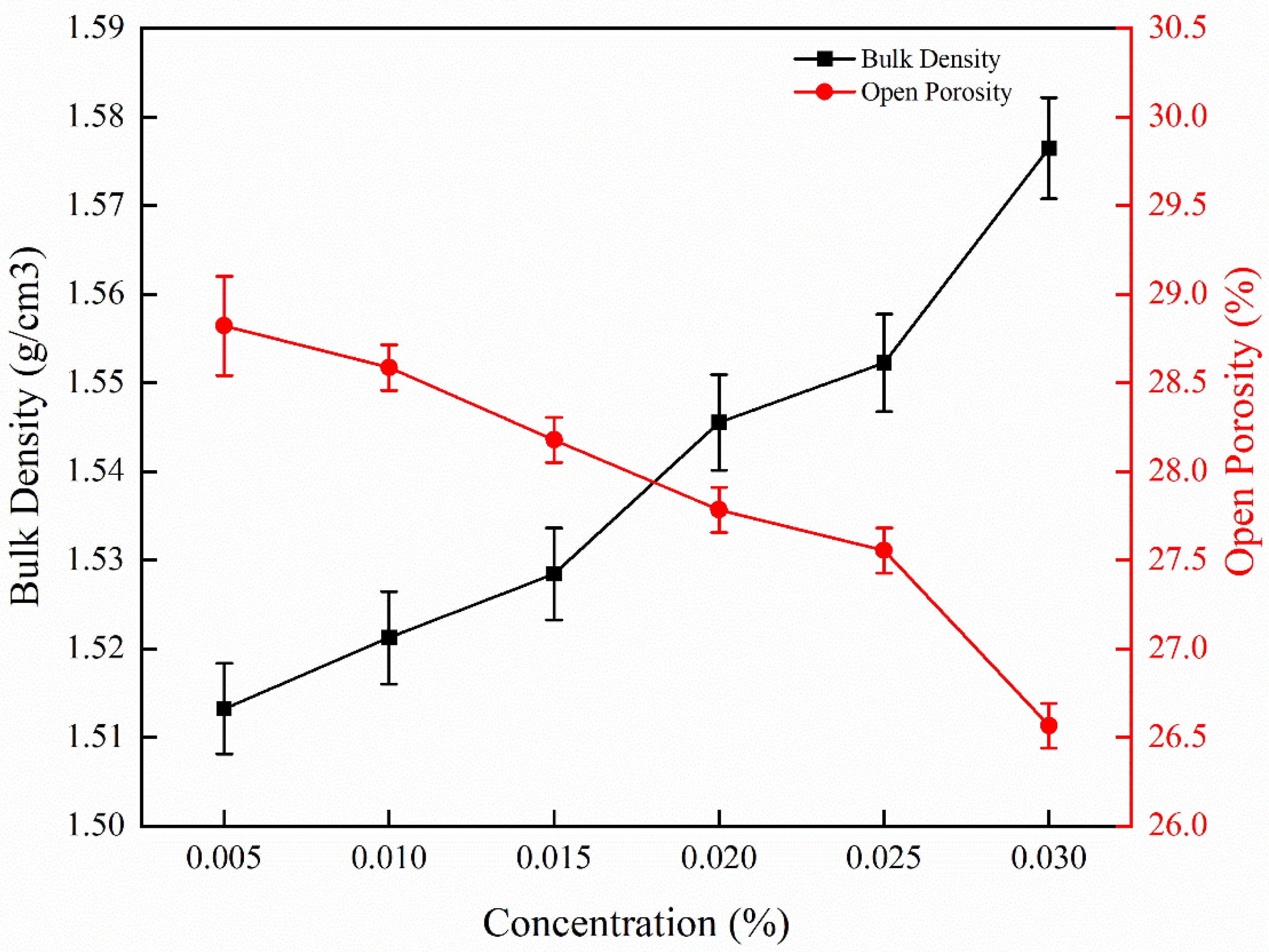 The results for samples impregnated with YCl3 solutions of different concentrations are shown in Fig. 10. When yttrium concentration increased from 0.005 mol/L to 0.030 mol/L, the bulk density increased 3.62% by 0.055 g/cm3 (from 1.521 ± 0.004 g/cm3 to 1.576 ± 0.005 g/cm3), and the porosity decreased by 2.02% (from 28.59 ± 0.13% to 26.57 ± 0.14%). The sintering densification for the samples impregnated with YCl3 was lower than that observed for samples impregnated with Y(NO3)3. This difference is caused by the difference between nitrate and chloride ions. NO3- is not thought to affect silica directly, but indirectly by affecting the system environment [47]. As shown in Fig. 3 and Fig. 4, when the concentration of YCl3 solution was increased to 0.020 mol/L, the densification of the samples improved, but when the concentration increased to 0.030 mol/L, many pores and cracks appeared in the microstructure of the sample. Therefore, with the increase of the concentration of the solution, the increase of the concentration of ionized ions increased the difference between the two solutions, resulting in different properties.