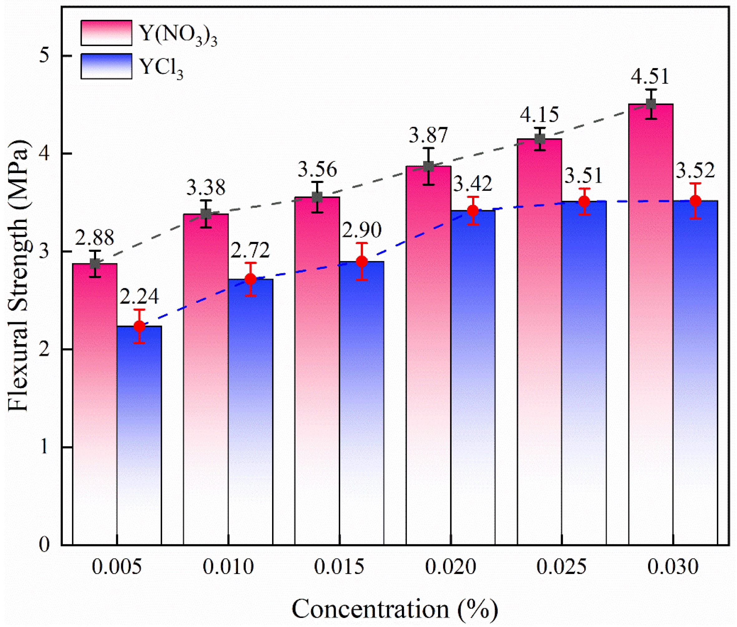 Fig. 11 shows the flexural strength of samples impregnated with solutions with different concentrations of Y(NO3)3 and YCl3. With the increase of the concentration, the strength of the impregnated samples increased to different degrees depending on the type of solution used. When the concentration increased from 0.005 mol/L to 0.030 mol/L, the strength of the sample impregnated with Y(NO3)3 solution increased by 56.60% (from 2.88 ± 0.13 MPa to 4.51 ± 0.15 MPa). When the concentration increased from 0.005 mol/L to 0.030 mol/L, the strength of the sample impregnated with YCl3 solution increased by 57.14% (from 2.24 ± 0.17 MPa to 3.52 ± 0.18 MPa). The strength of samples impregnated with Y(NO3)3 solution and YCl3 solution was the highest at the highest concentration (0.030 mol/L).