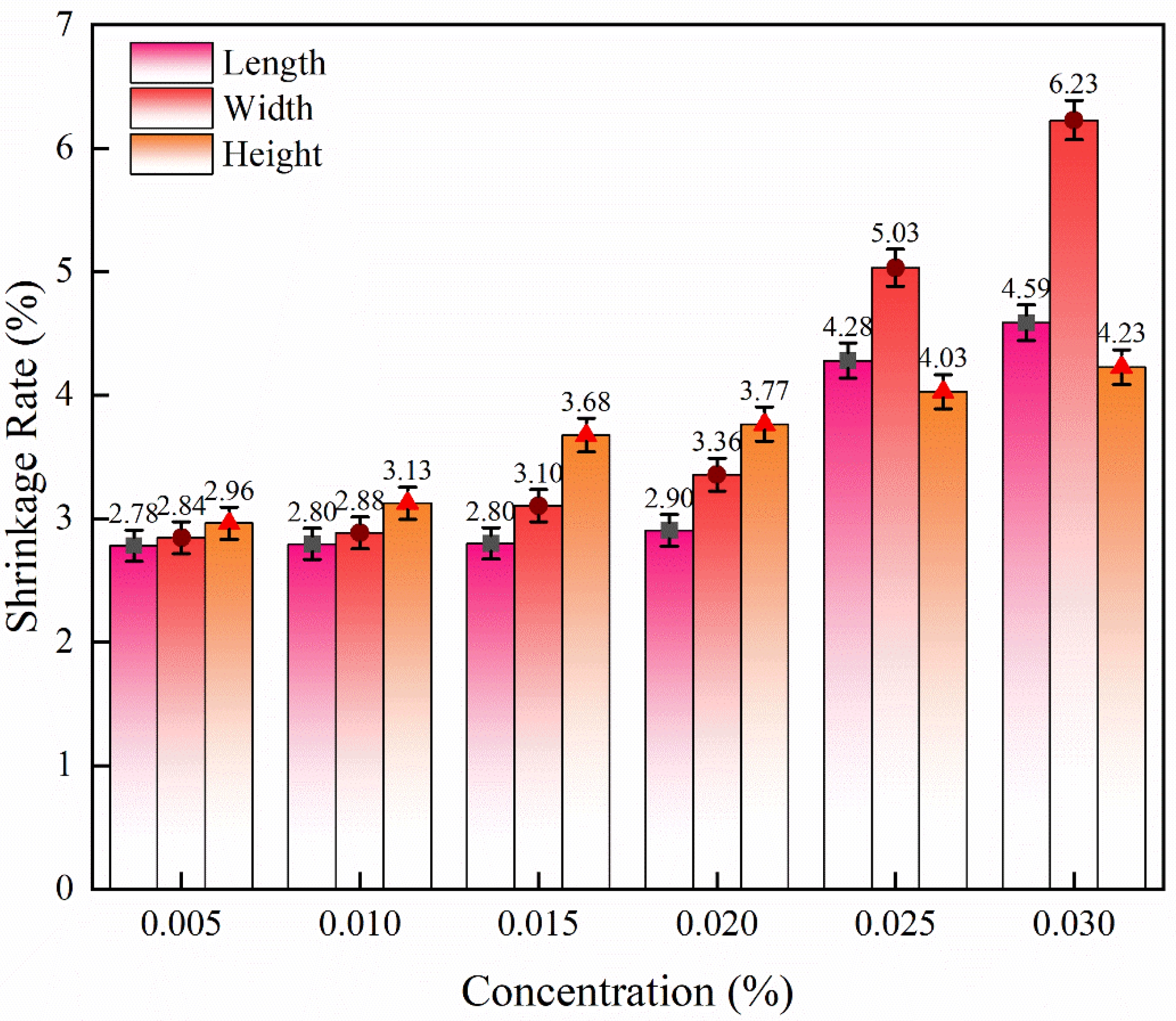 The shrinkage rate of the sintered samples is related to the solid content, porosity and density after sintering. Due to the anisotropy of 3D printed ceramics, the shrinkage rate of the samples in different directions is significantly different [48-51]. The shrinkage in the length direction and the width direction is mainly related to the structure density caused by the intra-layer particle rearrangement, while the shrinkage in the height direction is mainly caused by the intra-layer and inter-layer particle rearrangement. Therefore, the height direction usually has a higher shrinkage rate.