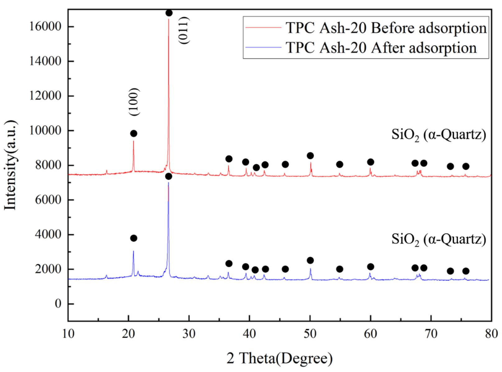 Figure 2 compares the XRD patterns of coal fly ash containing 20% quartz before and after calcination at 1000 ℃. It can be observed that both pre-calcined and post-calcined TPC Ash-20 exhibit a α-quartz phase structure (JCPDS Card No. 85-0504). However, the full width at half maximum (FWHM) of the (011) plane in TPC Ash-20 was determined to be 0.142o, whereas that of quartz-adsorbed TPC Ash-20 increased to 0.202o. The broadening of the XRD peak indicates a decrease in crystallinity. Furthermore, the relative intensity of the quartz (100) plane compared to quartz (011) plane also increased from 23.6% to 31.1% after adsorption, this indicates that as silica gradually adsorbs onto quartz, the anisotropy between the various crystal planes decrease. These results suggest that calcination effectively promotes the adsorption of amorphous silica from fly ash onto quartz, thereby deteriorating the crystallinity as reflected by the increased FWHM. This indicates that calcination successfully facilitates the adsorption of amorphous silica from fly ash onto quartz, thereby reducing the X-ray diffraction intensity. Additionally, the broadening of diffraction peaks suggests that the adsorbed amorphous silica gradually establishes crystallographic relationships with α-quartz during the adsorption, grain boundary diffusion, and recrystallization processes [18, 19]. This observation will be further corroborated by SEM analysis.