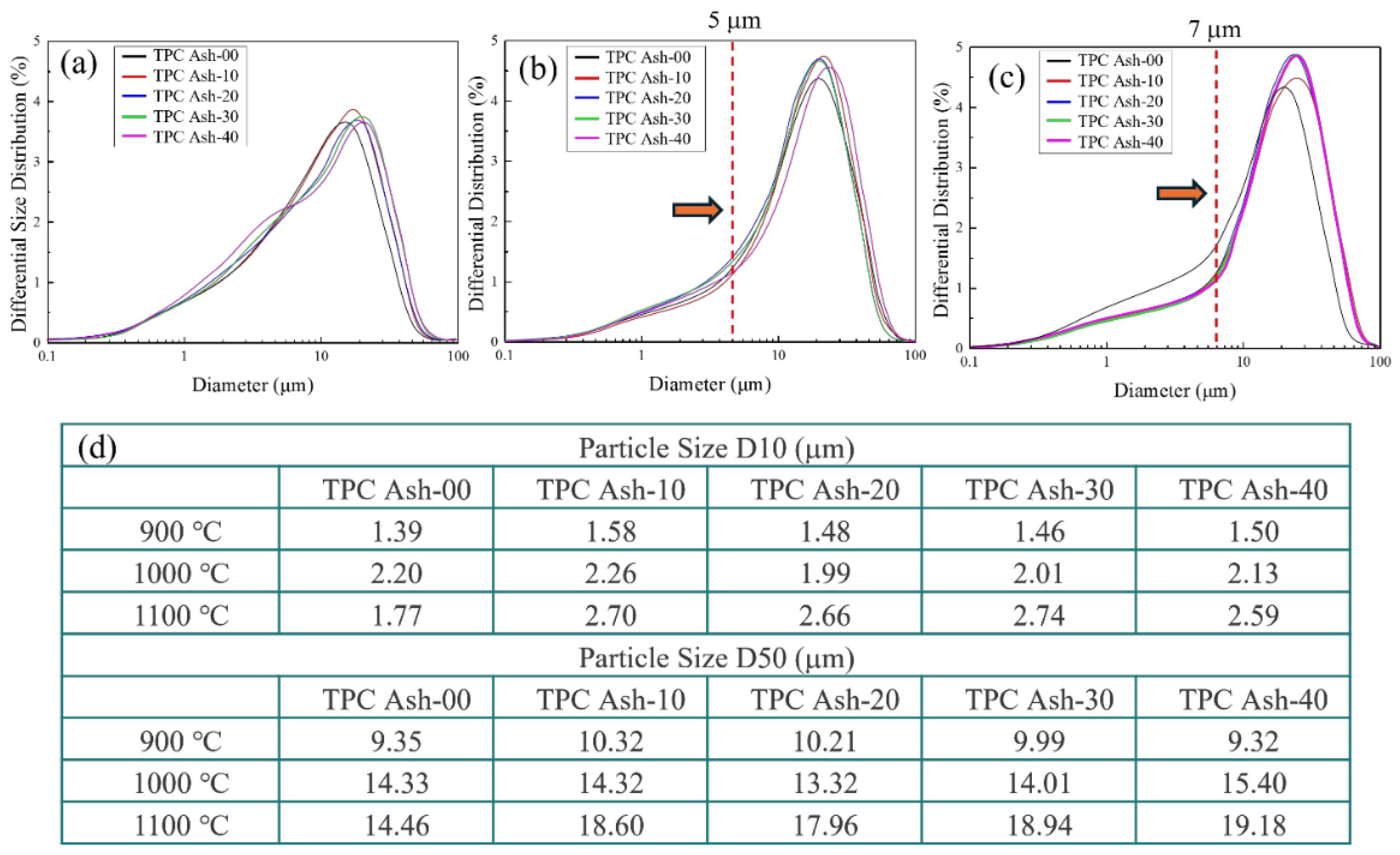 Figure 3 presents the laser particle size analysis results of the calcined powders, providing further evidence of the adsorption effect of quartz. The particle size analyzer measurements confirm that the average particle size (D50) of the powders exhibits a continuous aggregation trend with increasing calcination temperature. A comparison between the samples containing quartz and TPC Ash-00 (without quartz) reveals distinct differences in particle size evolution with increasing temperature. At a sintering temperature of 900 °C, the average particle size gradually develops a bimodal distribution with increasing quartz content, as shown in Fig. 3(a). When the sintering temperature reaches 1000 °C, the fraction of fine particles decreases significantly, forming larger aggregated particles. At 1100 °C, this trend continues, with the fine particle fraction further decreasing and the proportion of larger particles increasing as shown in Fig. 3(c). Besides, as the arrow pointing, the beginning point of distribution peak also increase from 5 μm to 7 μm from 1000 °C to 1100 °C, making the peak narrow and move to larger size distribution. These results indicate that the addition of quartz significantly enhances the temperature-dependent growth in average particle size [20, 21]. Moreover, for TPC Ash-00, the D50 increased from 9.35 μm at 900 °C to 14.33 μm at 1000 °C, but remained relatively stable at 14.46 μm at 1100 °C as shown in Fig. 3(d). In contrast, for TPC Ash-20, the D50 increased from 10.32 μm at 900 °C to 14.32 μm at 1000 °C, and further increased to 18.60 μm at 1100 °C. Furthermore, when the quartz addition was increased to 30% and 40%, the average particle size D50 at 1100 °C increased to 18.94 μm and 19.18 μm, respectively. This suggests that the initially stable fly ash particles, upon the introduction of SiO₂, become more prone to adhesion onto the quartz surface due to thermal effects, leading to an increase in the overall particle size [22, 23]. A similar trend can also be observed in the particle size distribution of D10. Consequently, the aggregation effect in coal fly ash with added quartz becomes more pronounced at high temperature.