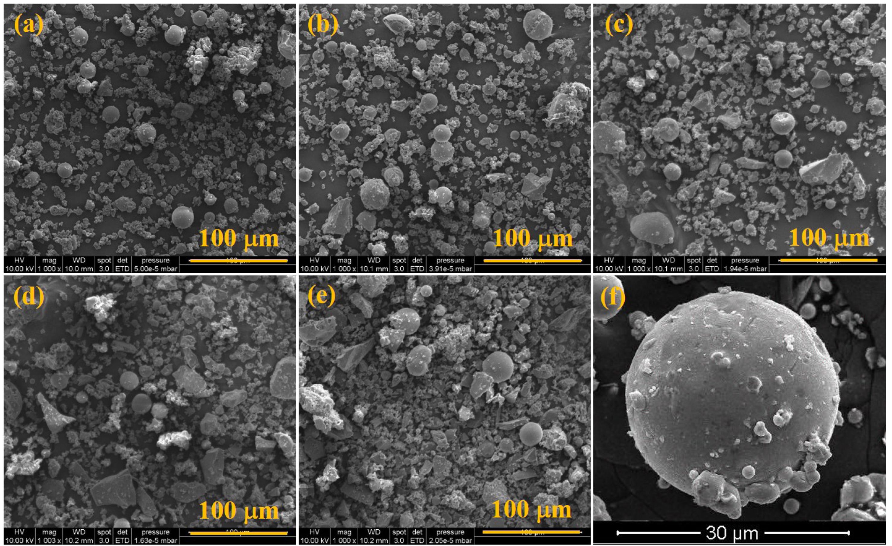 Figure 4(a)–4(e) presents the SEM images of TPC-Ash 00, TPC-Ash 10, TPC-Ash 20, TPC-Ash 30, and TPC-Ash 40. The SEM analysis of fly ash samples with added quartz revealed a microstructure characterized by spherical or irregularly distributed particles. Consistent with the results of particle size analysis, varying the proportion of added silica did not lead to significant differences in the particle size distribution of the regenerated silica powder. However, a noteworthy observation is that in samples containing quartz, numerous finer silica particles were found to be adsorbed onto the surfaces of larger silica grains, as shown in Fig. 4(f). This suggests that quartz promotes the aggregation of finer silica particles, likely through enhanced surface interactions and diffusion effects at elevated temperatures [24, 25]. Additionally, in samples with a higher quartz content, larger particles exhibited more pronounced adhesion of smaller particles, indicating that quartz plays a crucial role in facilitating particle coalescence and stabilization during thermal processing.