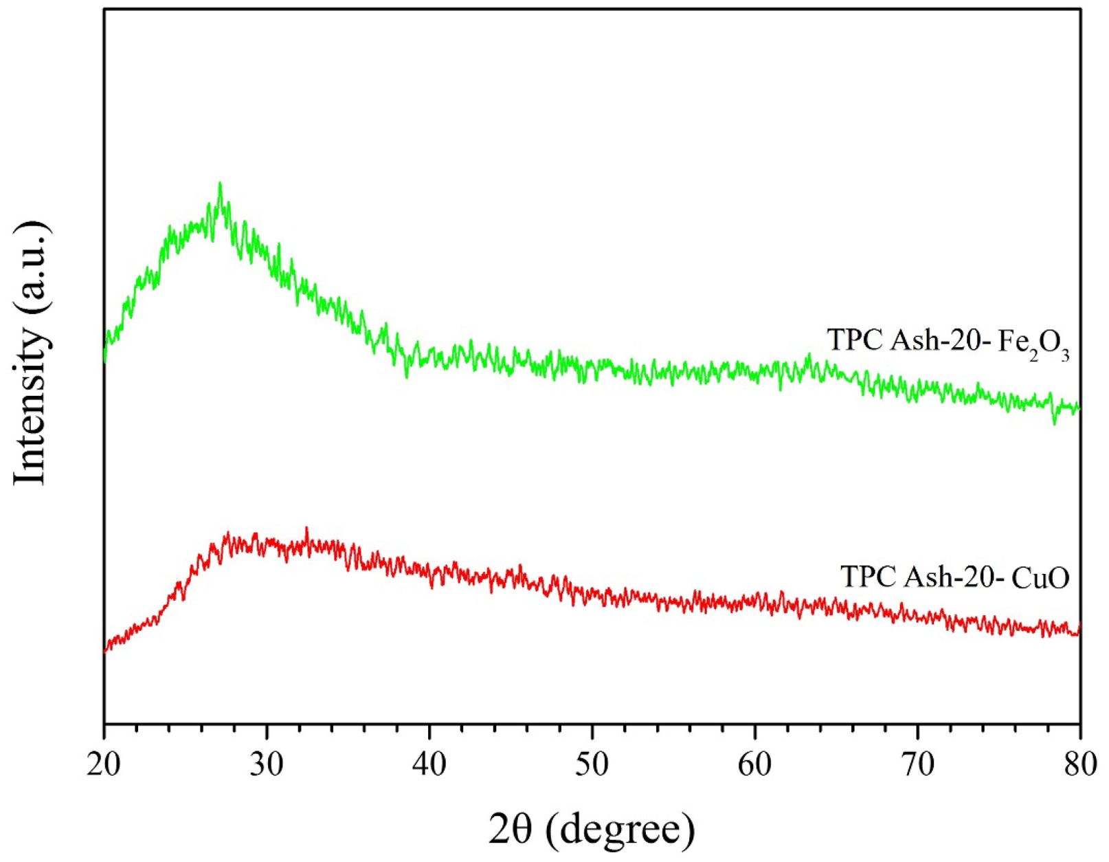 Table 1 presents the XRF analysis results for TPC Ash-10 and TPC Ash-20 following calcination. As reported in a previous study [11], the chemical compositions of both samples closely resemble that of conventional coal fly ash. The addition of quartz primarily results in an increased concentration of silicon dioxide (SiO₂), while the concentrations of other major oxides—such as aluminum oxide (Al₂O₃), iron oxide (Fe₂O₃), calcium oxide (CaO), potassium oxide (K₂O), and titanium dioxide (TiO₂)—remain largely unchanged. These findings indicate that the fundamental chemical characteristics of the fly ash are retained, with the observed variations primarily attributable to the externally introduced quartz.