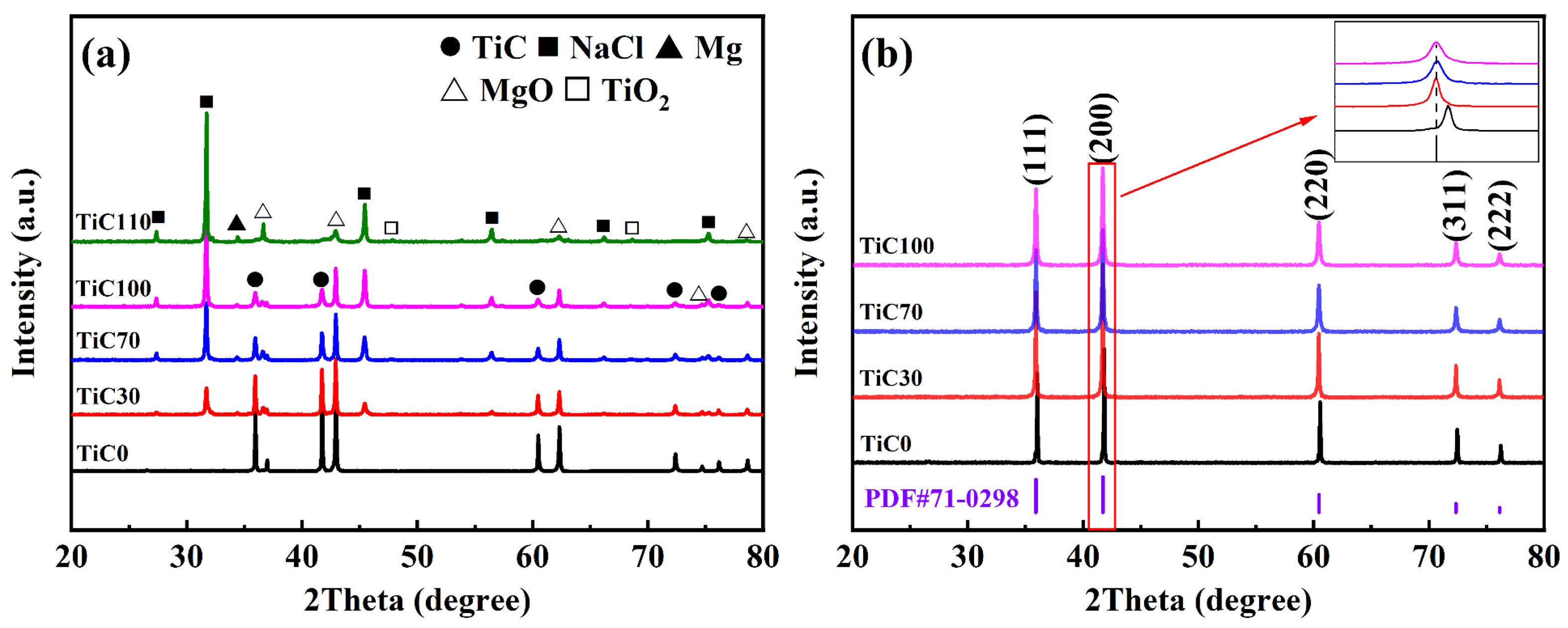 (> 1 kg) synthesis of high-melting-point nano-TiC powder via the combustion synthesis method. Following acid washing and subsequent rinsing with distilled water, by-products such as MgO and NaCl were completely removed from the as-synthesized carbonized powder, yielding a single-phase TiC product. The purity of TiC in all samples exceeded 99 wt.%. With increasing NaCl content in the system, the particle size of TiC decreased, with the average particle size decreasing from 178 nm to 74 nm. The introduction of NaCl provided a liquid-phase environment that significantly enhanced the diffusion rate of reactants. Furthermore, during the cooling stage, the crystallization of molten salt helped suppress nanoparticle agglomeration. As the NaCl content increased, the phase transformation of the molten salt absorbed heat, leading to a decrease in the system’s adiabatic temperature and an increase in the degree of supercooling. Consequently, the thickness of the molten salt layer formed on the carbide surface increased, effectively reducing the crystal growth rate and promoting nucleation. This ultimately resulted in further refinement of the nano-TiC particle size. This study provides technical guidance for the large-scale synthesis of nano-TiC powder and establishes a foundation for the application of TiC-based materials in high-end industries.