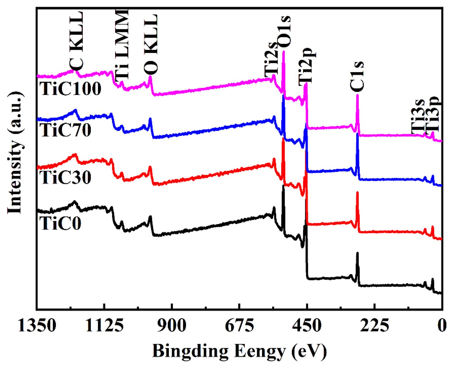 Fig. 6 presents the XPS full spectrum of nano-TiC synthesized in a molten salt environment, illustrating the chemical bonding states on the surface of the powder particles. The TiC surface is primarily composed of three elements: Ti, C, and O. The atomic ratios of these elements are summarized in Table 5. Quantitative surface analysis reveals that as the salt content in the system decreases, the composition of the synthesized TiC approaches the ideal stoichiometric ratio. In addition to Ti and C, a small amount of O is also detected on the particle surface, with its content showing a positive correlation with the amount of NaCl added. This observation is consistent with the results of other phase characterization technique.