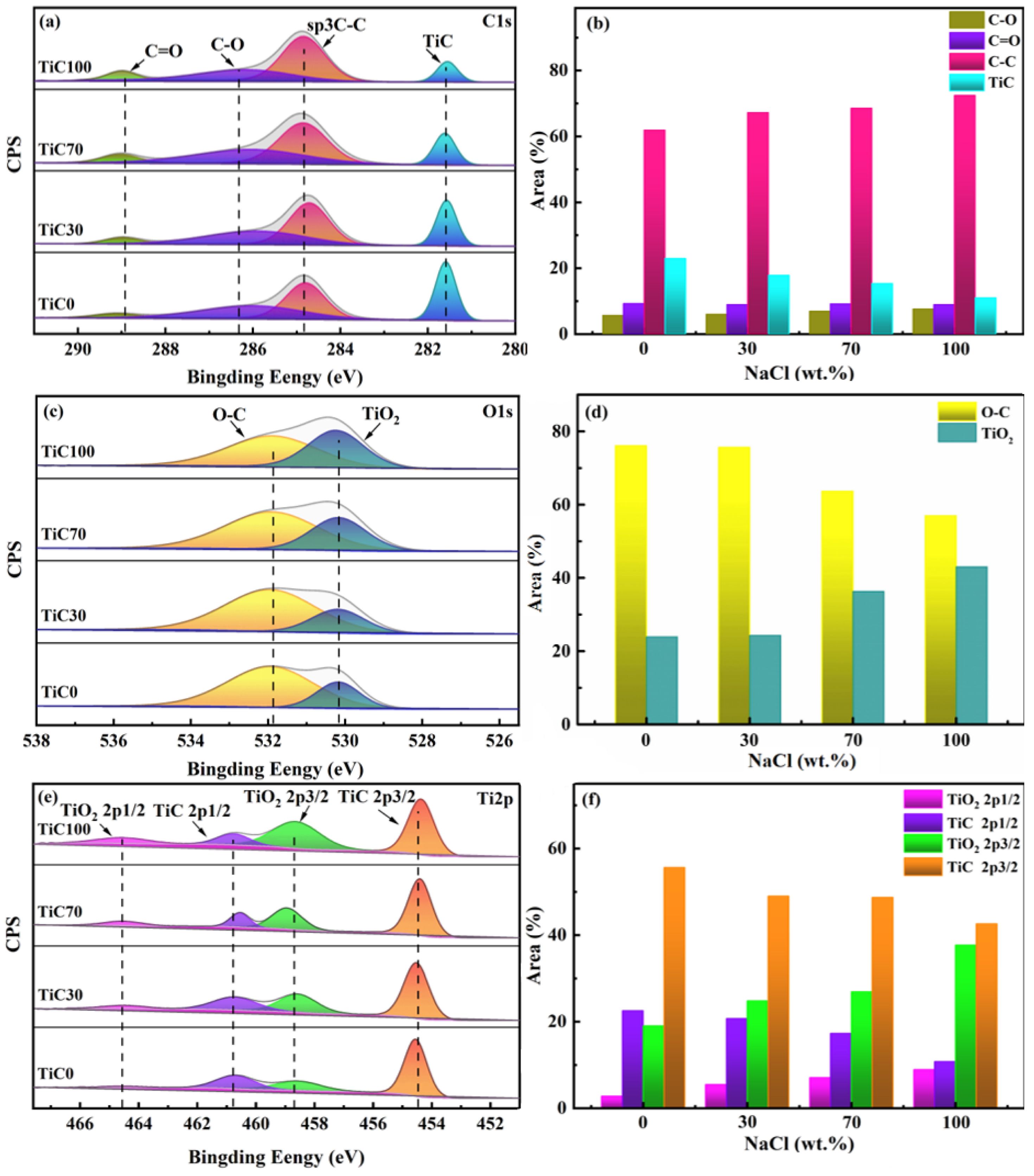 Fig. 7 XPS spectra and chemical state proportions of TiC synthesized with different amounts of NaCl: (a, b) C1s; (c, d) O1s; (e, f) Ti 2p. |