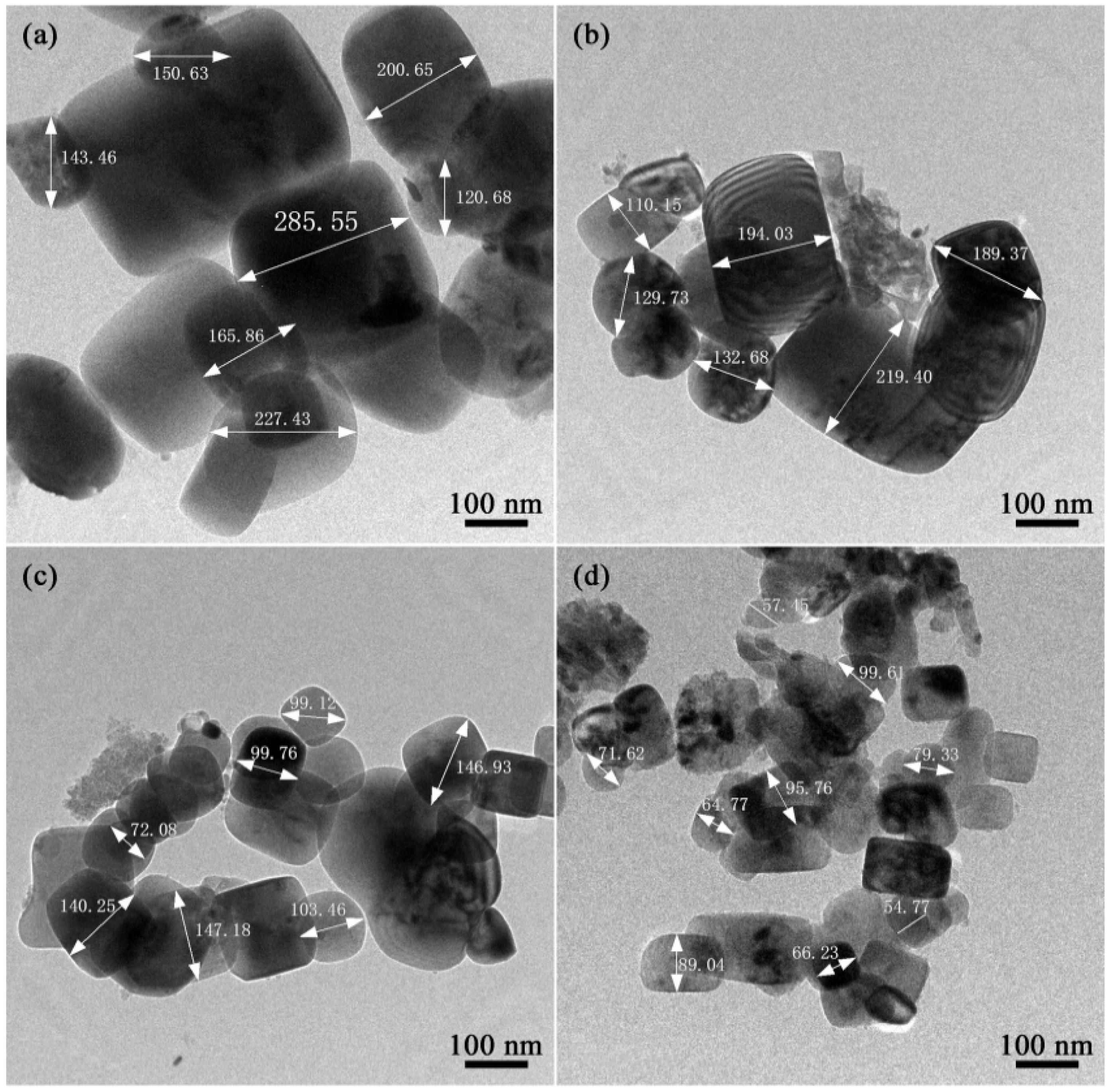 Fig. 9 presents the TEM images of TiC powders synthesized with varying amounts of NaCl. In the absence of NaCl addition, the synthesized TiC particles exhibit a relatively large size and an inhomogeneous particle size distribution, as illustrated in Fig. 9a. Upon the introduction of the molten salt diluent, a significant reduction in particle size is observed, with the grain size decreasing from over 300 nm to as small as approximately 30 nm (Fig. 9b-d). Most particles display a cubic morphology, while smaller particles tend to adopt a near-spherical shape. When the NaCl content is increased to 100 wt.%, the particle size distribution becomes more uniform; however, slight agglomeration is still observed among the finer particles, which is consistent with the SEM analysis. The results indicate that molten salt NaCl, acting as a diluent, absorbs heat during the synthesis process and effectively suppresses grain growth. Compared to the case without diluent addition, the appropriate incorporation of NaCl enables the synthesis of TiC powders with finer and more uniform particle sizes.