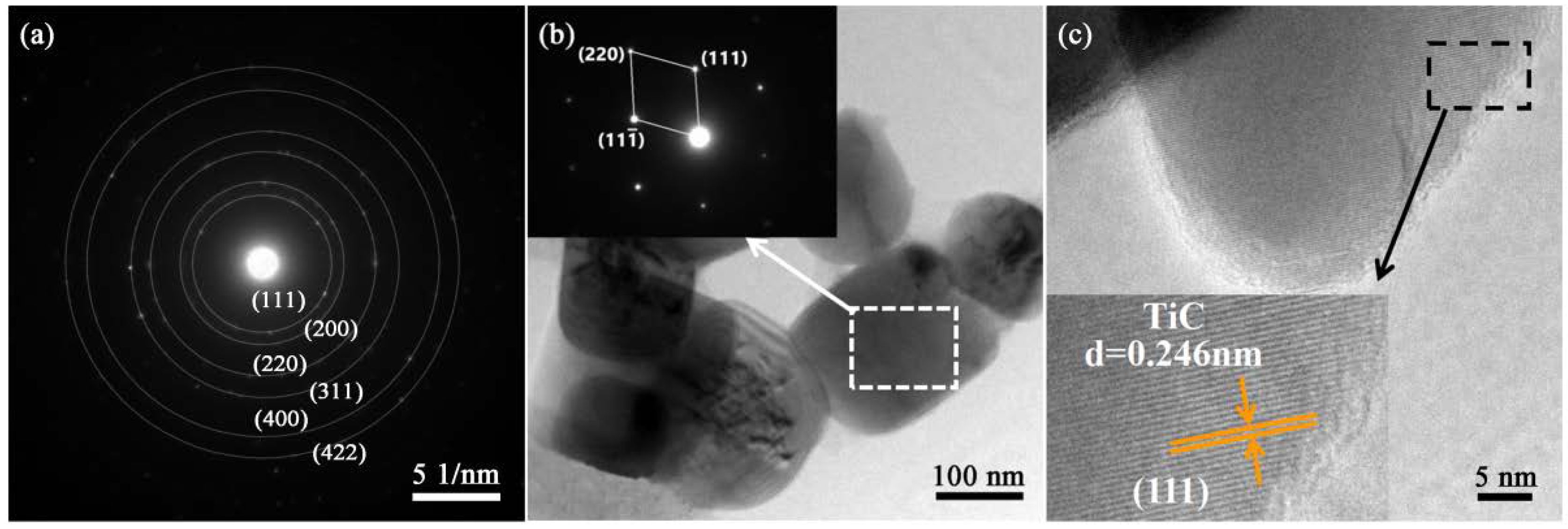 Fig. 10 presents the representative high-resolution transmission electron microscopy (HRTEM) image of the synthesized nano-TiC powder along with its corresponding selected area electron diffraction (SAED) pattern. As illustrated in Fig. 10a, the diffraction rings observed in the SAED pattern, from the innermost to the outermost, correspond to the (111), (200), (220), (311), (400), and (422) crystallographic planes of face-centered cubic TiC. These diffraction features exhibit clear polycrystalline characteristics, confirming that the synthesized TiC nanoparticles possess a high degree of crystallinity and excellent dispersion. In the low-magnification bright-field TEM image (Fig. 10b), the particle surfaces appear clean and morphologically flat. The corresponding SAED pattern displays distinct diffraction spots, further supporting the presence of single-crystal domains within the TiC nanostructures. HRTEM analysis provides more direct evidence of the crystalline nature of TiC, revealing continuous and well-defined lattice fringes, as shown in Fig. 10c. These lattice fringes indicate a highly ordered atomic arrangement within the nanoparticles. The measured lattice spacing is 0.246 nm, which closely matches the (111) interplanar spacing of standard TiC (d = 0.249 nm, PDF#71-0298), thereby further confirming the accuracy of the crystal structure.