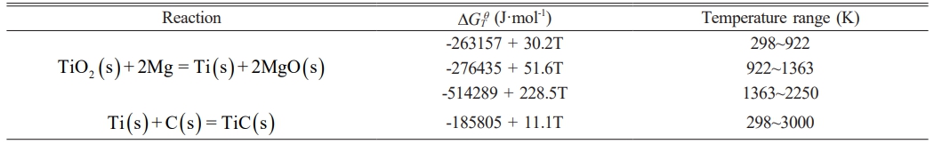 The thermodynamic data for the TiO2-C-Mg system were obtained from the “Handbook of Thermodynamic Diagrams: Inorganic compounds and elements” [29]. Using Eq. (3) and (4), the relationship between the standardDGTq of the system’s reaction and temperature was calculated, as presented in Table 2.