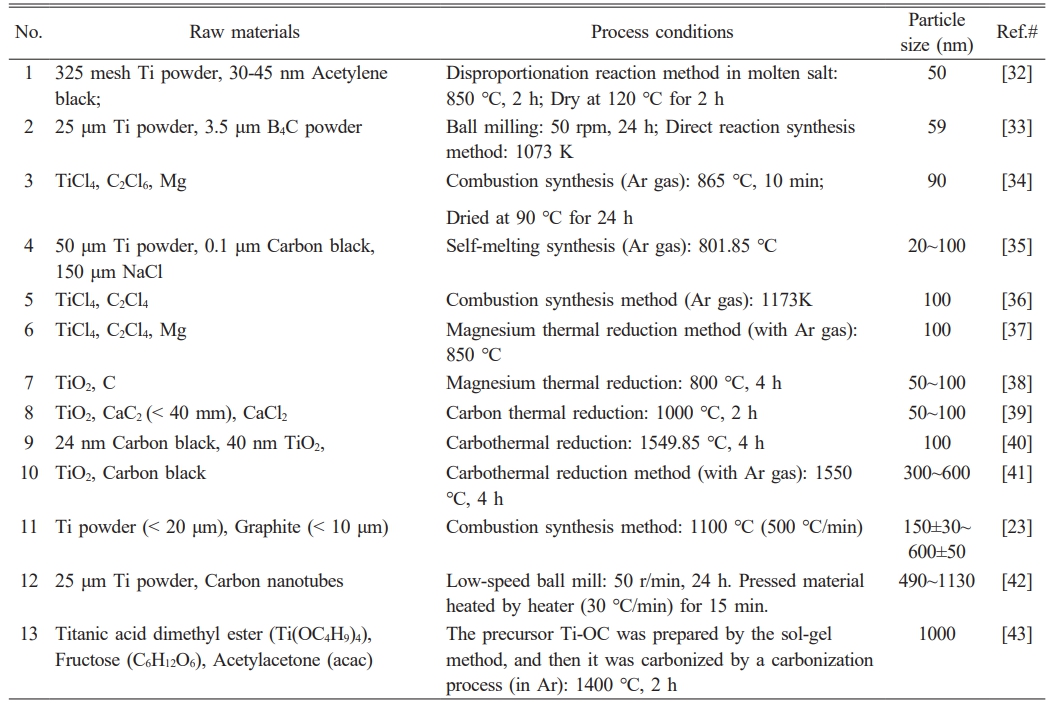 Driven by advancements in science and technology as well as improvements in industrial production capabilities, the manufacturing sector has imposed increasingly stringent demands on the particle size, performance, and production scale of TiC. Notably, the particle size, purity, and morphology of TiC exert a significant influence on its functional properties. Submicron or nano-sized powders exhibit distinctive properties, including the small size effect, quantum size effect, and surface effect. These characteristics enable them to be readily dispersed within a matrix, thereby significantly enhancing the performance of composite materials and leading to their widespread application across various fields [6-8]. Nevertheless, the current state of nanopowders development still falls short of meeting industrial requirements: not only in terms of precise control over particle size and purity, but also due to challenges such as high production costs, complex manufacturing processes, and the difficulty of achieving large-scale production [9, 10]. Therefore, the development and application of sub-micron and nano-scale powders are attracting growing scientific and industrial interest. It is anticipated that future technological advancements will enable further size reduction into the nanoscale regime, enhanced purity with reduced impurity content, and improved functional properties. The particle size, purity, and microstructural characteristics of these powders significantly influence their overall performance. Jam et al. fabricated TiC particles with average particle sizes of 1.67 μm and 1.35 μm, respectively, and conducted a systematic investigation into the comprehensive mechanical properties of the corresponding sintered bodies. The results demonstrated that for an average TiC grain size of 1.67 μm, the sintered body exhibited a hardness of 86.4 ± 1 HRA and a flexural strength of 739 ± 24 MPa. When the average grain size was reduced to 1.35 μm, the material achieved optimal comprehensive mechanical performance, with the hardness increasing to 89.4 ± 2 HRA and the flexural strength reaching 724 ± 27 MPa. Qiu et al. [11] synthesized TiC powder with a particle size of 607 nm and carried out a preliminary investigation into its sintering behavior. The results demonstrated that TiC ceramics sintered at 2000 °C under a pressure of 40 MPa for a holding duration of 2 h exhibited hardness and fracture toughness values of 15.92 GPa and 3.22 MPa·m1/2, respectively. Ko et al. [12] synthesized TiC particles with a nominal size of 100 nm and systematically investigated their effect on the mechanical properties of TiC/Fe3Al composites. The results demonstrated that the flexural strength of the metal ceramic containing 50 vol.% and 70 vol.% TiC both exceeded 1700 MPa.