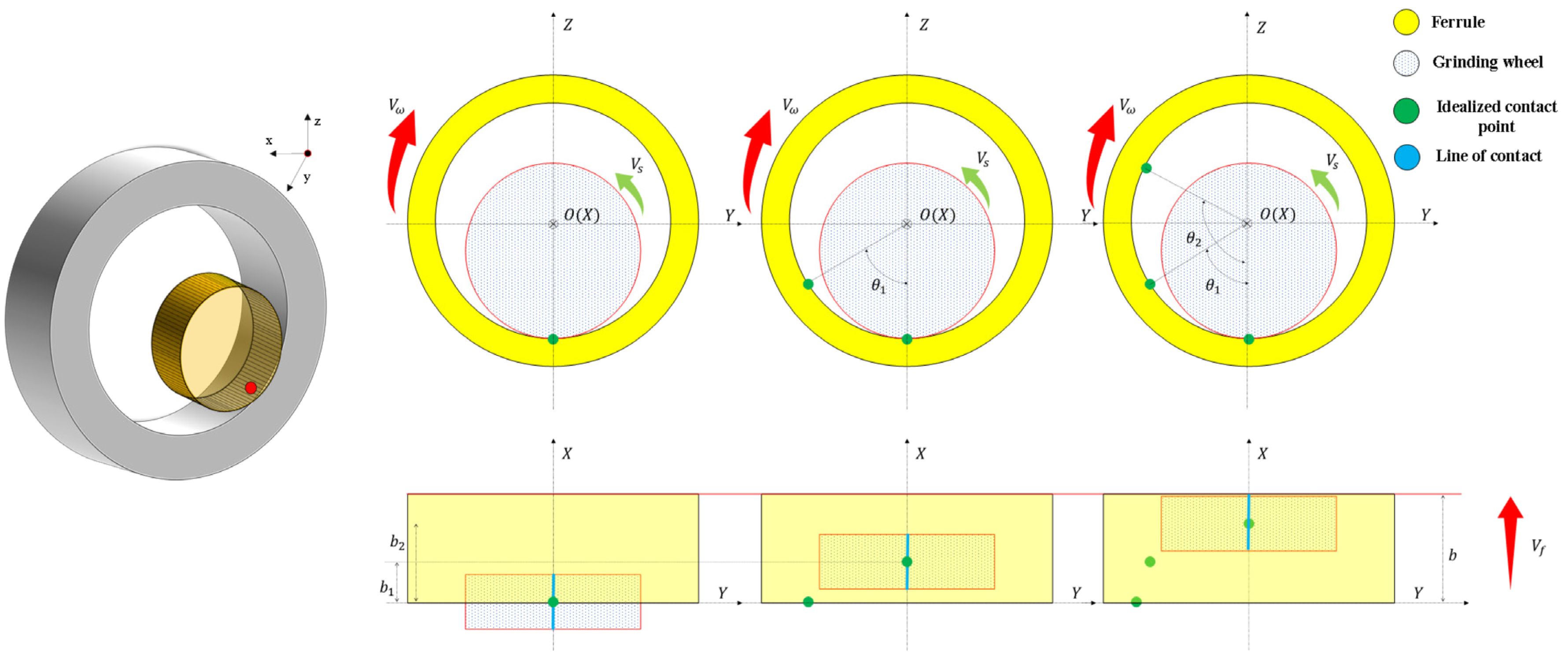 As shown in Fig. 2, a coordinate system is established with the center of the workpiece's end face circle as the origin. The contact arc surface between the grinding wheel and the workpiece is simplified to a contact point, and the coordinates of the contact point at different times can be expressed as: