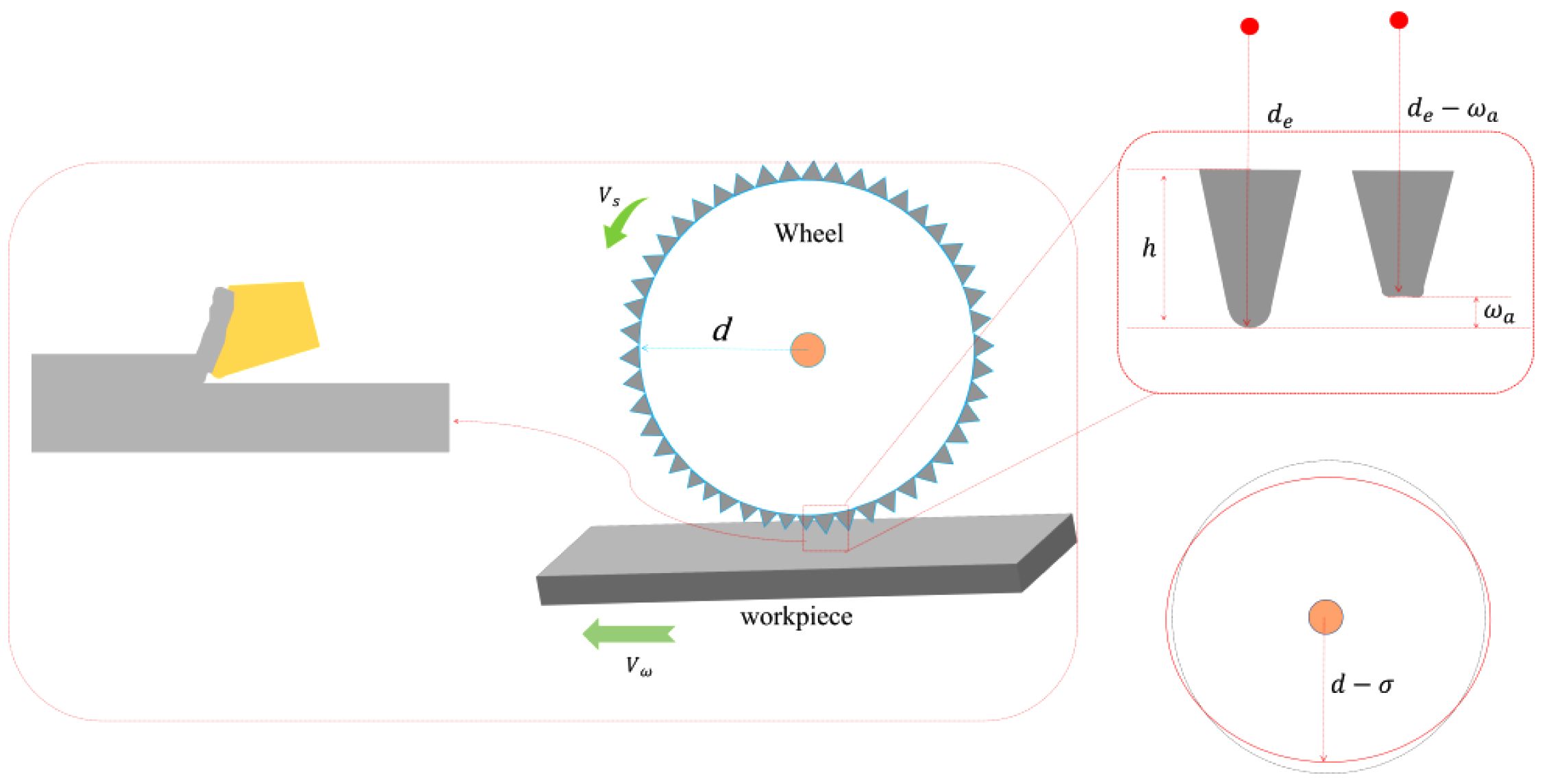 During the grinding process, the expression relating the wear amount of the abrasive grains per revolution of the grinding wheel to the grinding parameters is [26]: