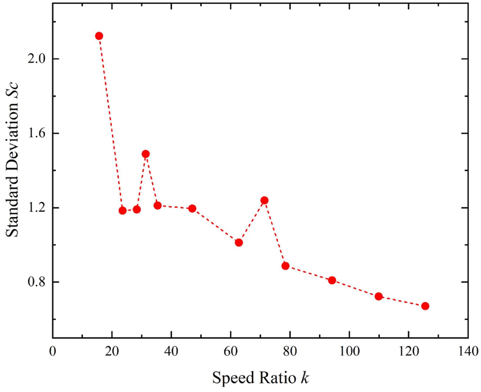 The variation of standard deviation Sc with the speed ratio k is shown in the Fig. 5. As the speed ratio increases, Sc exhibits a downward trend, which indicates that the uniformity gradually improves with the increase of the speed ratio k. When k ∈ [80, 130], the downward trend of Sc slows down gradually, meaning that the impact of increasing k on the uniformity of the machining trajectory is weakening. However, excessively large k values may cause a certain parameter of the equipment to exceed the stable operation range of the system, leading to large vibrations and other adverse effects.