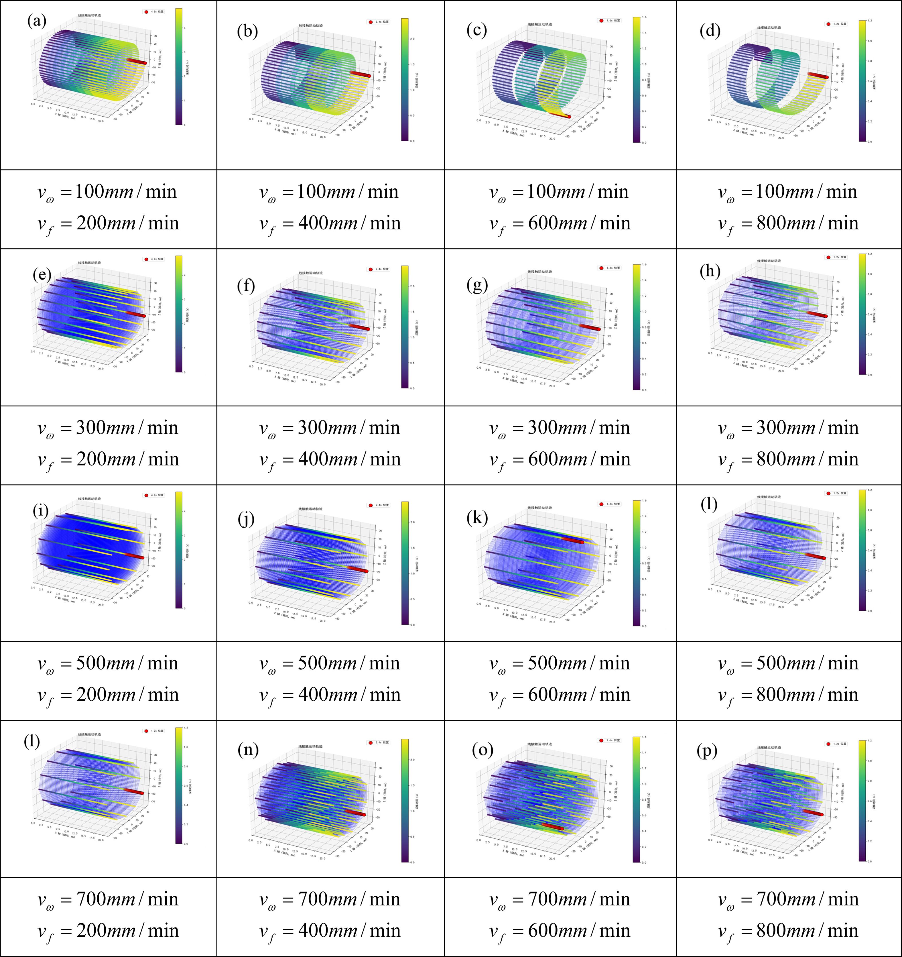 Kinematics simulation was performed on the machining contact points between the grinding wheel and the workpiece. With the grinding wheel width set to 5 mm, the contact zone was discretized into discrete points to observe their motion trajectories. Fig. 6 shows the trajectory simulation results. As indicated in Fig. (a), (b), (c), and (d), when the workpiece rotational speed is 100 r/min, incomplete coverage of the surface trajectory occurs as the grinding wheel oscillation speed increases from 200 mm/min to 800 mm/min. At this point, the speed ratio k gradually decreases. This implies that a low workpiece rotational speed cannot be paired with a high grinding wheel oscillation speed, which is detrimental to surface machining. In Fig. (e), (f), (g), and (h), with the workpiece rotational speed at 300 r/min, as the grinding wheel oscillation speed increases from 200 mm/min to 800 mm/min, At this point, the speed ratio k gradually decreases, the grinding wheel trajectory coverage is complete. However, the density of the trajectory decreases with the increase in the grinding wheel oscillation speed, suggesting that a lower oscillation speed can achieve a certain degree of spark-out effect. When the workpiece rotational speed reaches 500 r/min and 700 r/min, At this point, the speed ratio k increases. the density of the machining trajectory significantly increases. This indicates that selecting a high workpiece rotational speed is beneficial for improving surface quality. Additionally, according to Equation (19), increasing the grinding wheel oscillation speed can be regarded as reducing the single deep cutting depth of abrasive grains, which is conducive to enhancing the machined surface quality. Therefore, increasing the workpiece rotational speed while appropriately increasing the grinding wheel oscillation speed is conducive to improving the surface quality of machining. It can be seen that the trend of machining uniformity presented by the simulation results is consistent with the variation trend of standard deviation Sc with the speed ratio k.