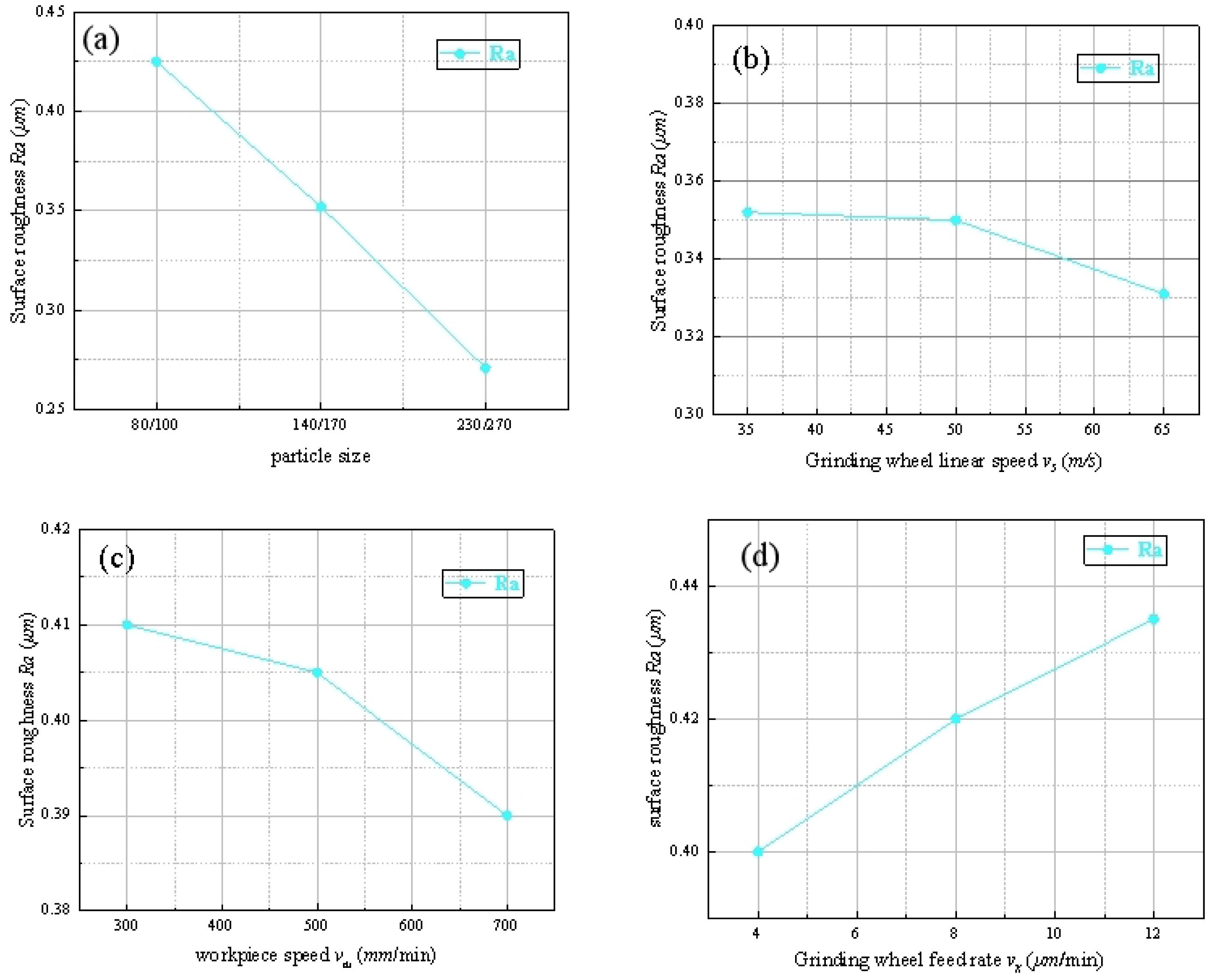 Analysis using the response surface methodology shows that the influence of the grinding wheel linear speed is not significant. In Fig. 8(b) and 9(b), it can be seen that as the grinding wheel linear speed increases from 35 m/s to 65 m/s, the variation in roughness is very small. Combining the results of the response surface methodology with the experimental results, it can be concluded that the increase in grinding wheel linear speed is not the main factor affecting the machined surface roughness. Therefore, in actual machining, an appropriate grinding wheel linear speed can be selected as the machining parameter according to the equipment conditions.