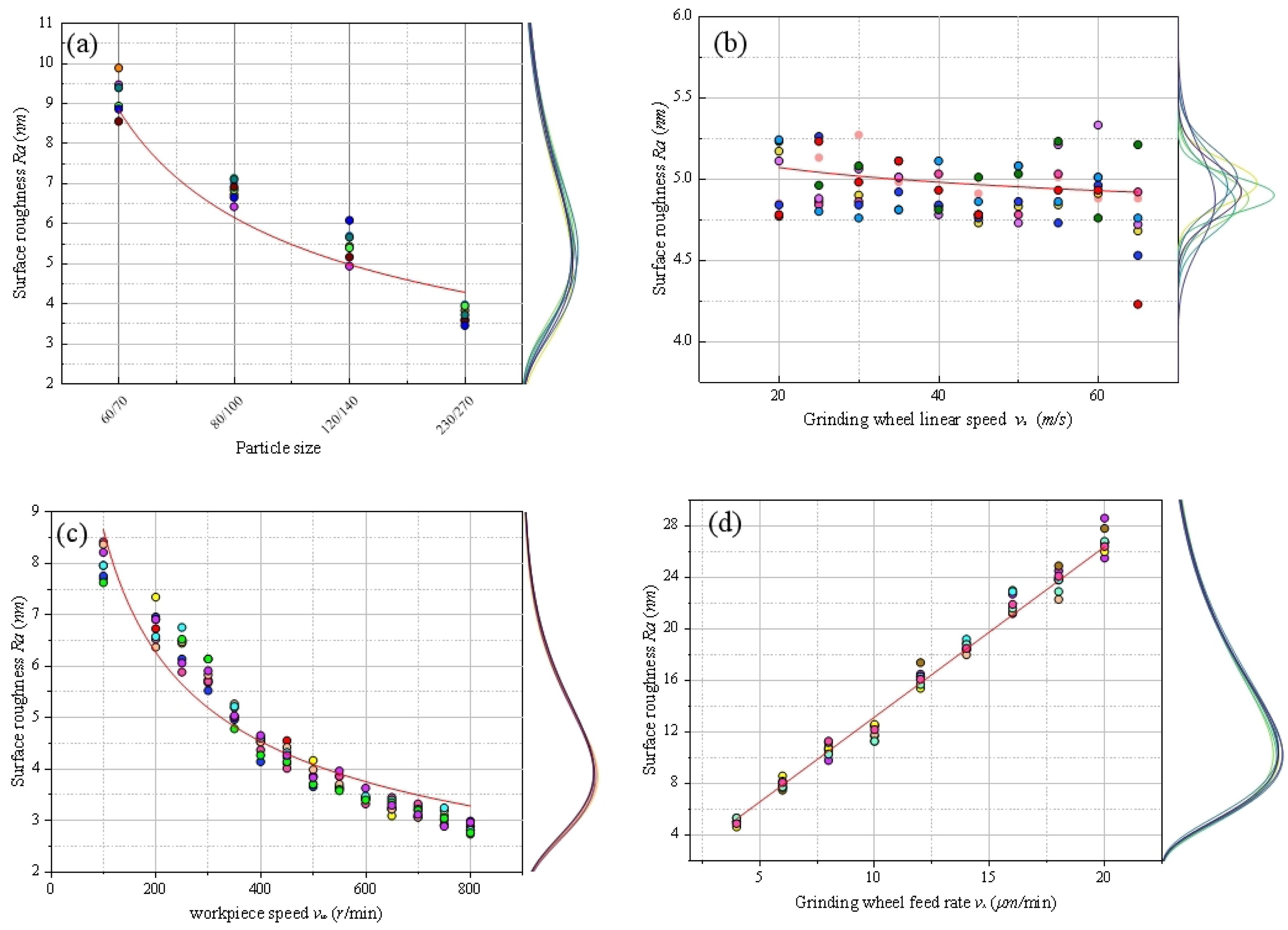 Each set of parameters was subjected to 8 simulations, and the roughness results of each simulation were recorded. The simulation results are presented in Fig. 8. Observing Fig (a), as the grinding wheel grit size decreases, the roughness gradually decreases. In Fig (b), as the grinding wheel linear speed increases, the overall change in roughness is slight, but the overall fitting trend shows a slight decrease. Similar discrepancies were also found in the studies of [11] and [12], which further supports this view. Fig. (c) indicates that increasing the workpiece rotational speed has a relatively significant effect on reducing the surface roughness; however, attention should also be paid to the reasonable configuration of the grinding wheel oscillation speed and the workpiece rotational speed mentioned in Section 3.2 to achieve better machining results. In Fig. (d), the grinding wheel feed rate has a relatively significant impact on the workpiece surface roughness.