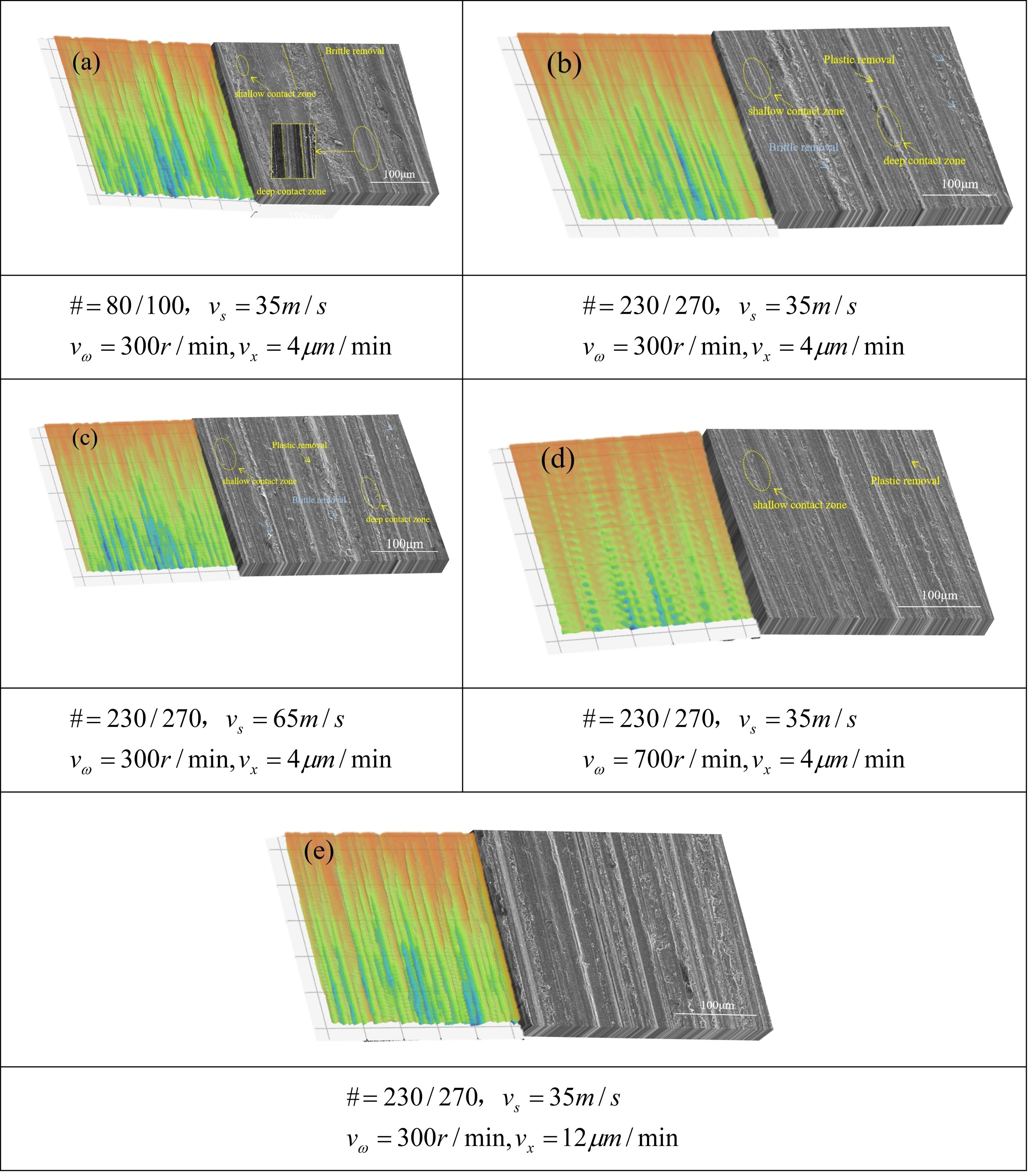 Increasing the grinding wheel feed rate, which can be regarded as increasing the machining depth per revolution, leads to an increase in the cutting depth of the abrasive grains (Fig. 10(e)). This is manifested as more abrasive grains removing material in a state of deep contact, resulting in deeper grooves, and the surface quality also changes accordingly. The changes in surface material morphology under different parameters are consistent with the variation trends of surface roughness in Fig. 8 and Fig. 9.