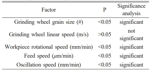 Three sets of parameters from the simulation parameters were selected for experiments, and the experimental results are shown in Fig. 9. Under the conditions of changing abrasive grain size, grinding wheel linear speed, workpiece rotational speed, and workpiece feed rate, the variation trend of roughness presented by the experimental results is basically consistent with that of the simulation results. However, the influence of the grinding wheel linear speed on roughness is not significant; therefore, the response surface methodology is adopted to conduct significance analysis of the experimental parameters.